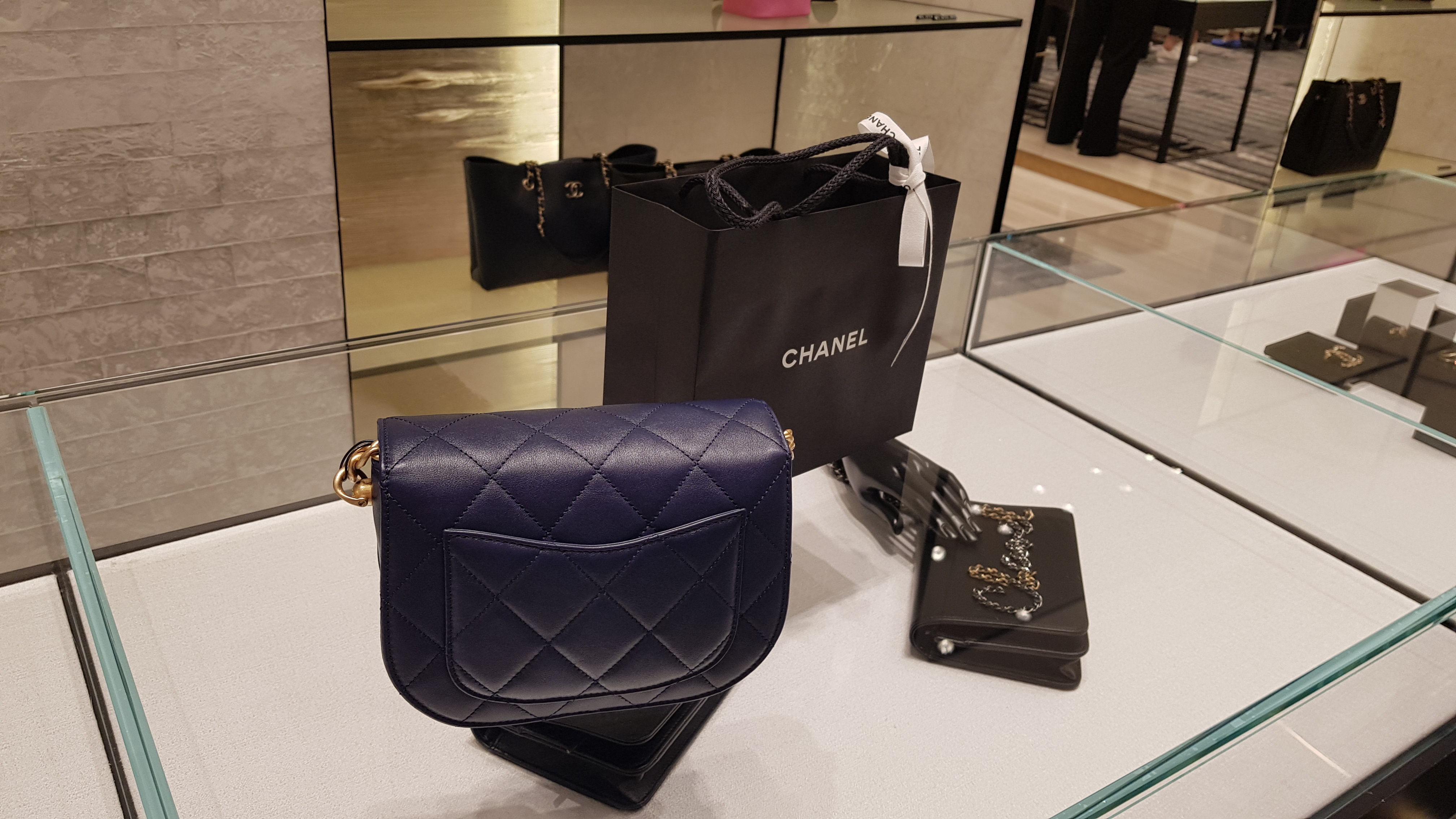 오래 기다리고 어렵게 샤넬 매장에 가더라도 물건이 많지가 않아 원하는 물건을 살 수가 없었다. 아내가 원하는건 검정색의 한손에 착 감싸지는 작은 지갑이었는데 다 나가고 없었으며 핑크색의 진열된 물건밖에 없다고 했다. 진열된 지갑중에 남색의 반지갑보다는 약간 큰 사이즈의 지갑이 이쁘다며 꺼내서 이리저리 보고는 사기로 했다. 이렇게 오래 기다려서 들어왔으니 뭐라도 사야된다는 구매의지가 생긴다.