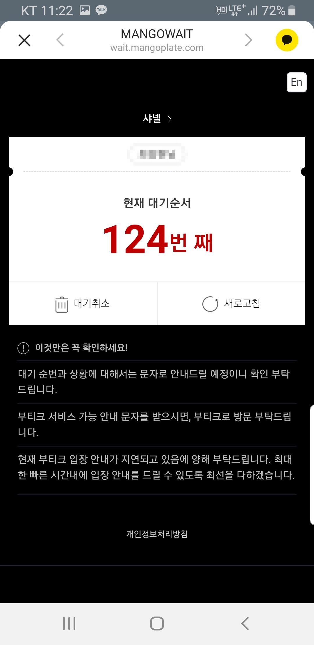 두번째 방문했을때이다. 수요일인가 오전 11시 조금 안되어서 방문했을때 대기번호 130번대를 받았었다. 위 캡쳐 사진은 오전 11시 22분에 대기 124번째 상태이다. 이때까지만 하더라도 백화점 돌아보고 점심먹고하면 들어갈 수 있겠지.. 라고 생각했다. 하지만 아이를 데리러 가야하는 3시가 되었는데도 대기번호가 50번대인가에서 머물러 있었고 결국 포기하고 집으로 돌아와야 했다. 언제나 입장할 수 있게 되나 보려고 대기취소를 누르지 않고 두었다.