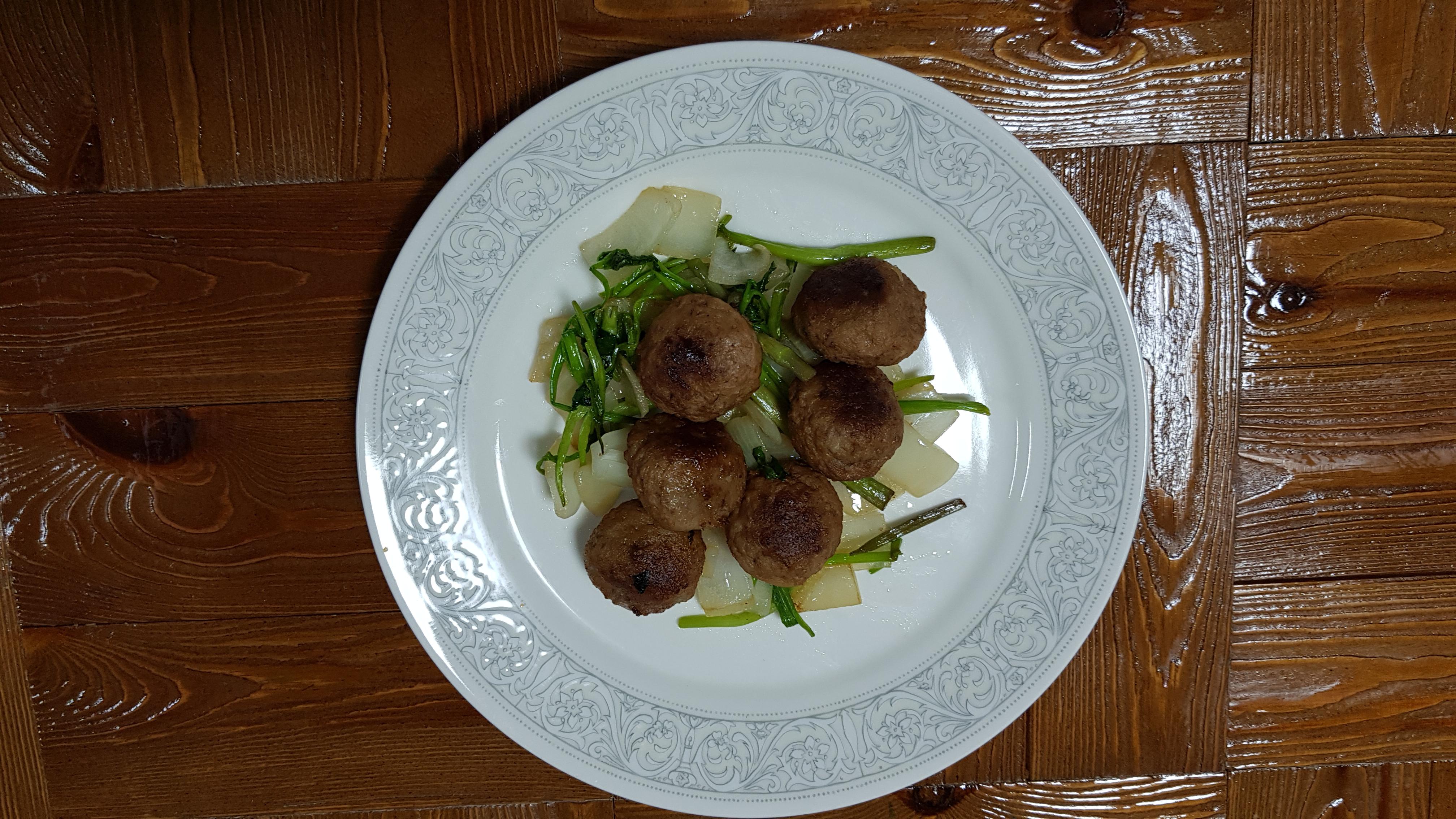 스파게티 소스를 넣은 미트볼 미나리 요리 (소스에 빠진 미미양) 이번 요리는 요리하는것보다 플레이팅이 어려웠다. ㅋ (그만큼 미트볼 요리가 간단하다.)