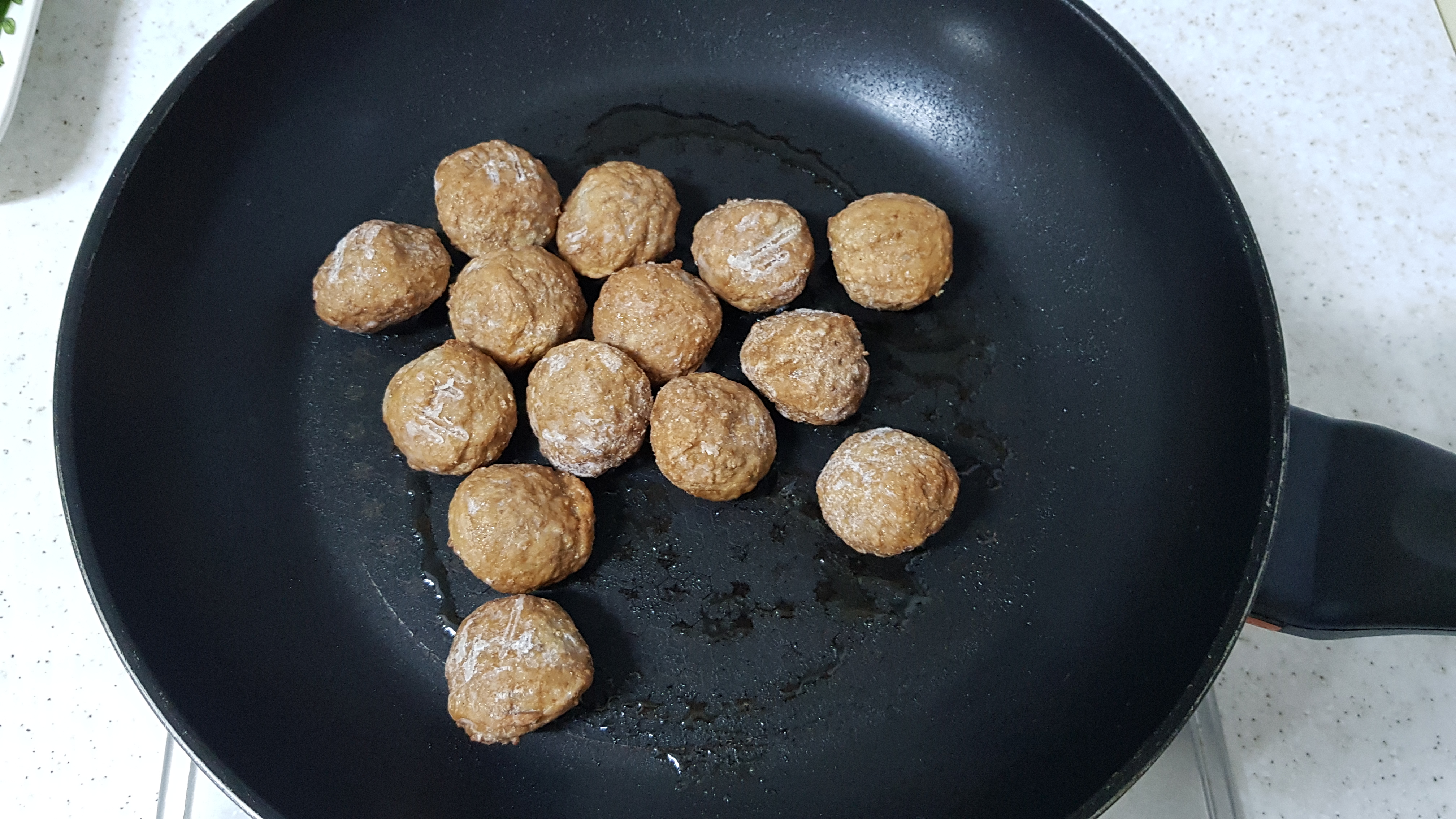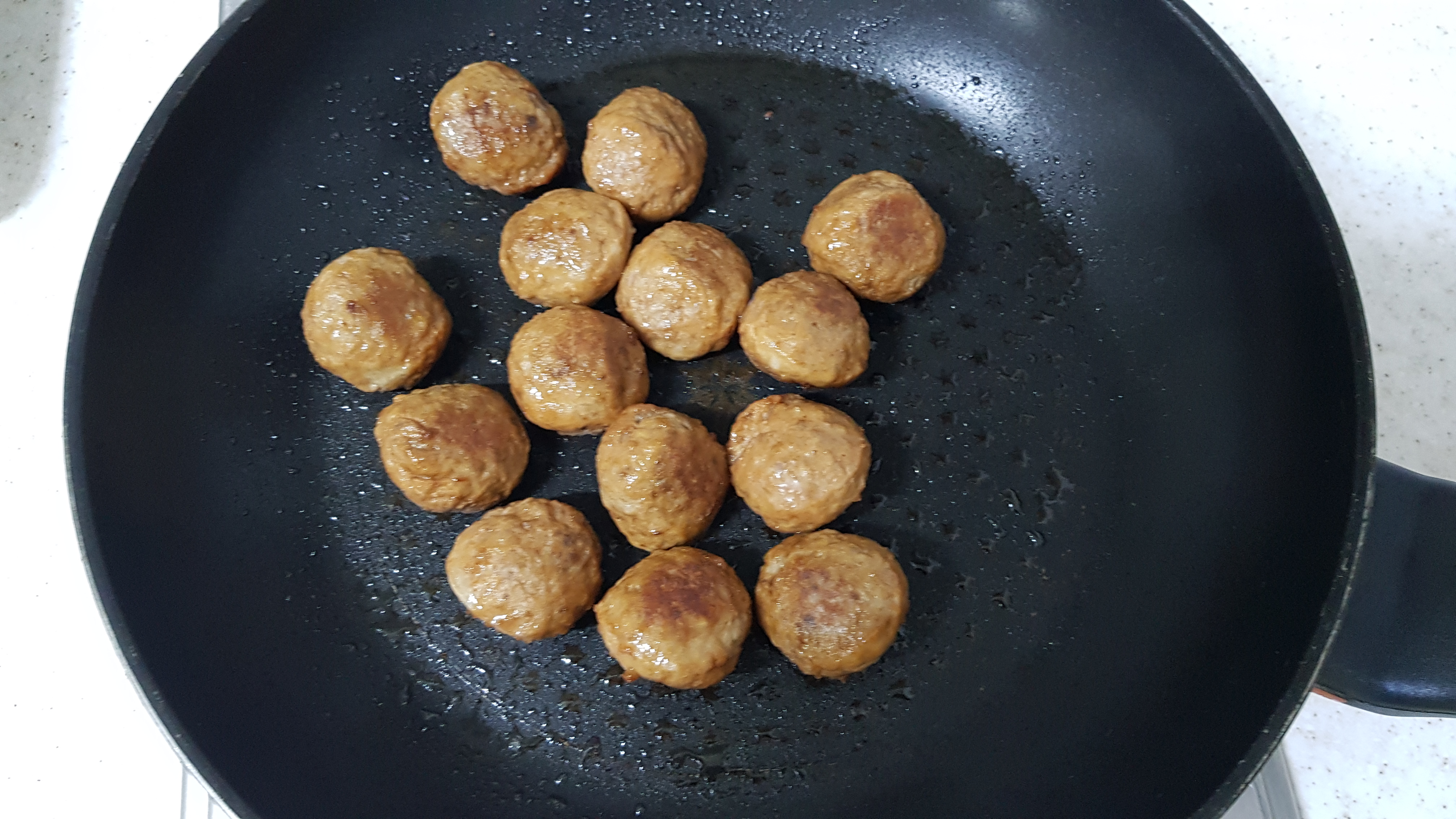 달궈진 후라이팬에 냉동된 미트볼 친구들을 덜어내고 굴려가며 익혀준다.