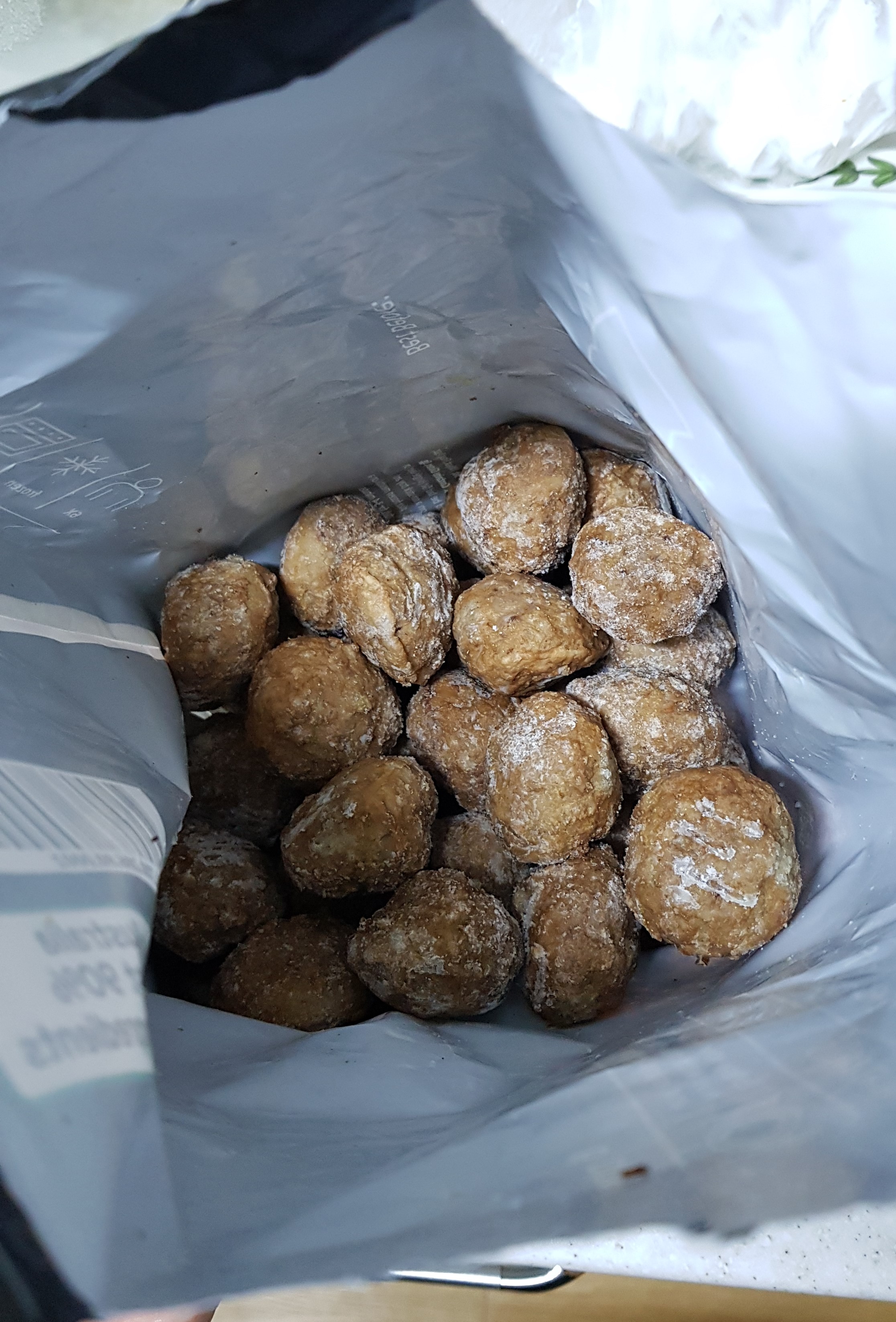 개봉해보니 1kg의 냉동된 미트볼 친구들이 모여있다. 열었을때 냉동상태에서도 미트볼 냄새가 확 느껴진다.