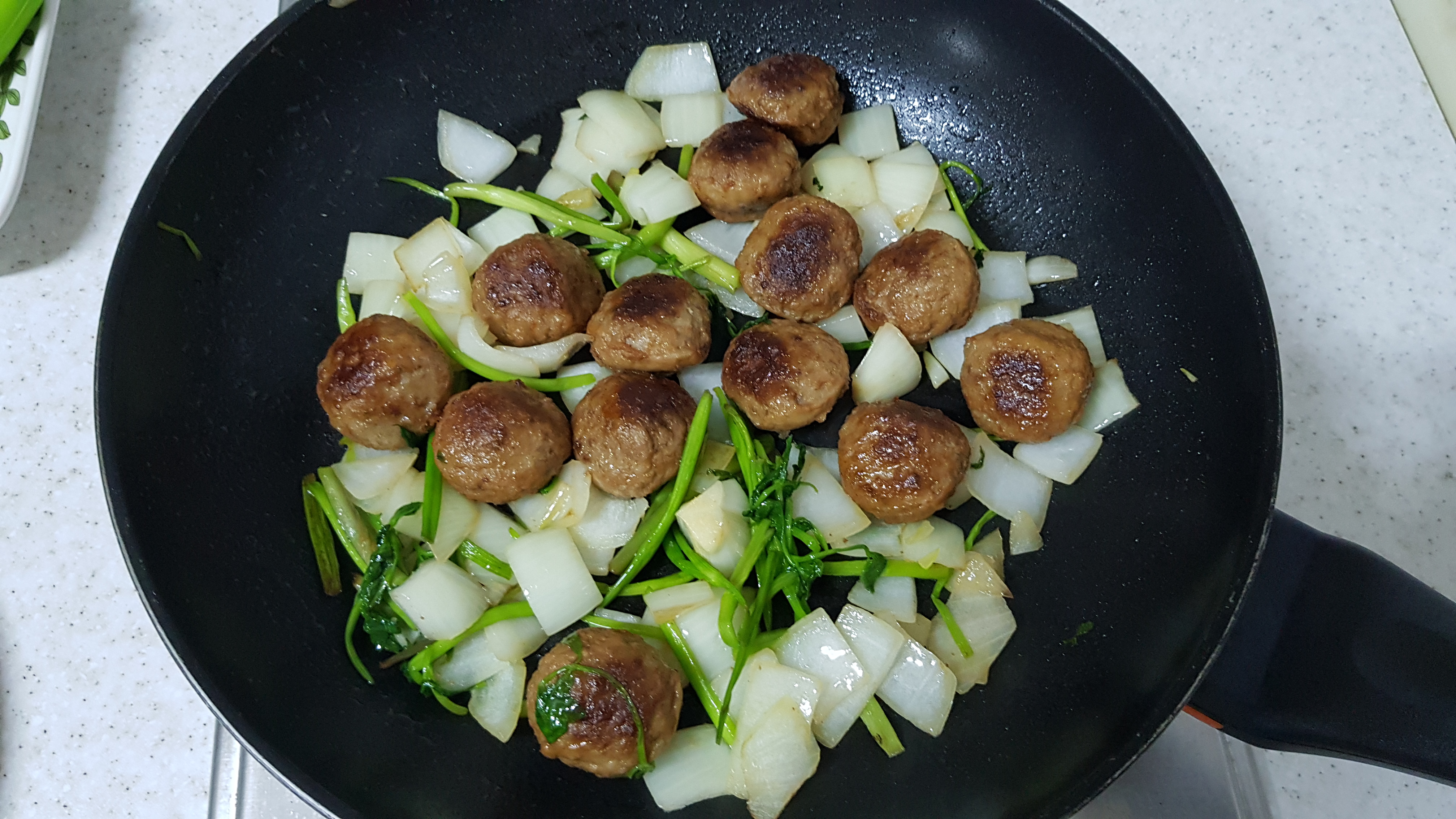 미트볼을 익히며 준비해둔 미나리와 양파를 넣고 5분정도 더 익혀준다.