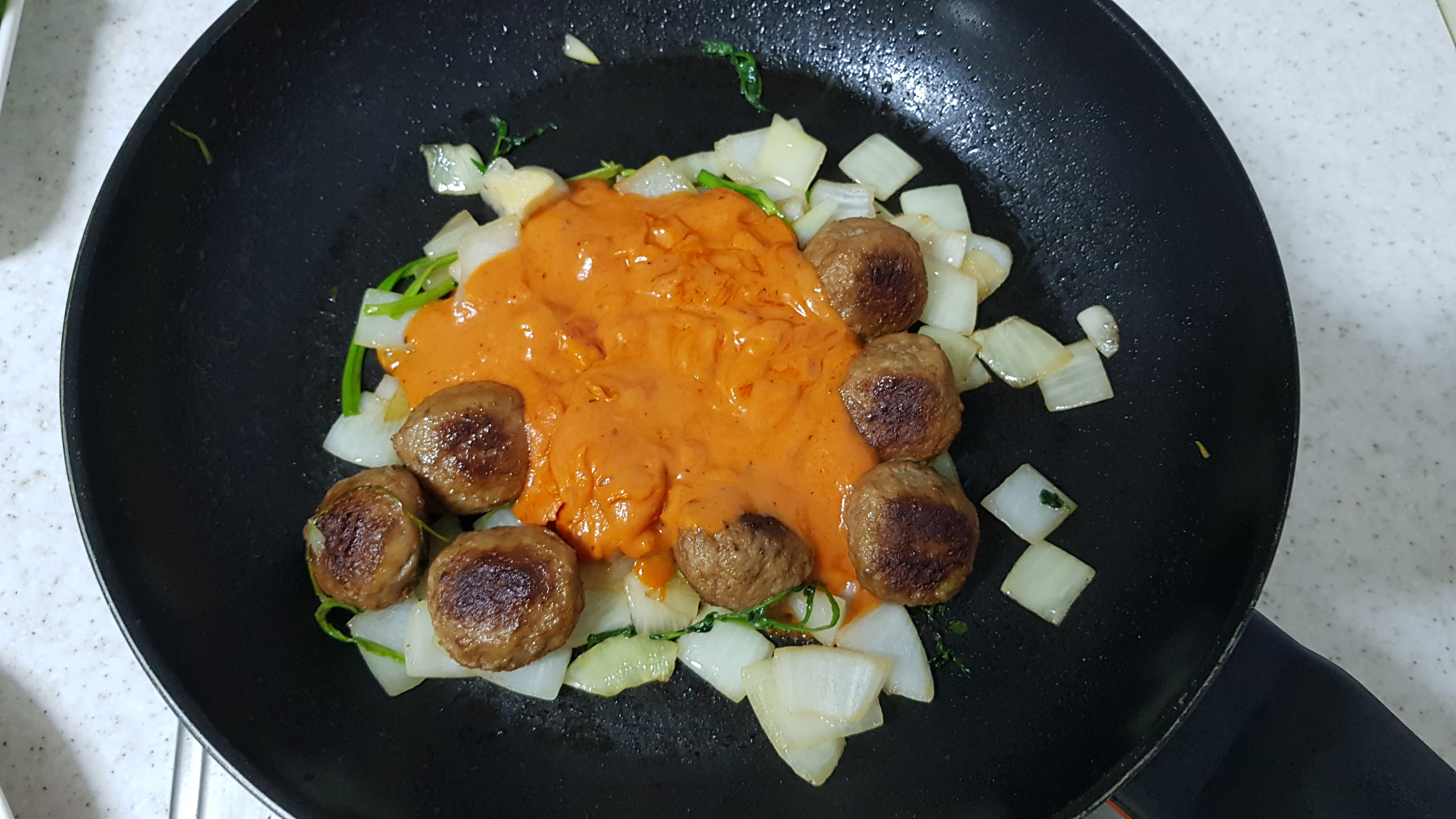 예전에 사둔 로제 스파게티 소스가 있어서 익히고 있는 미트볼 절반은 소스를 넣어서 해보기로 한다.