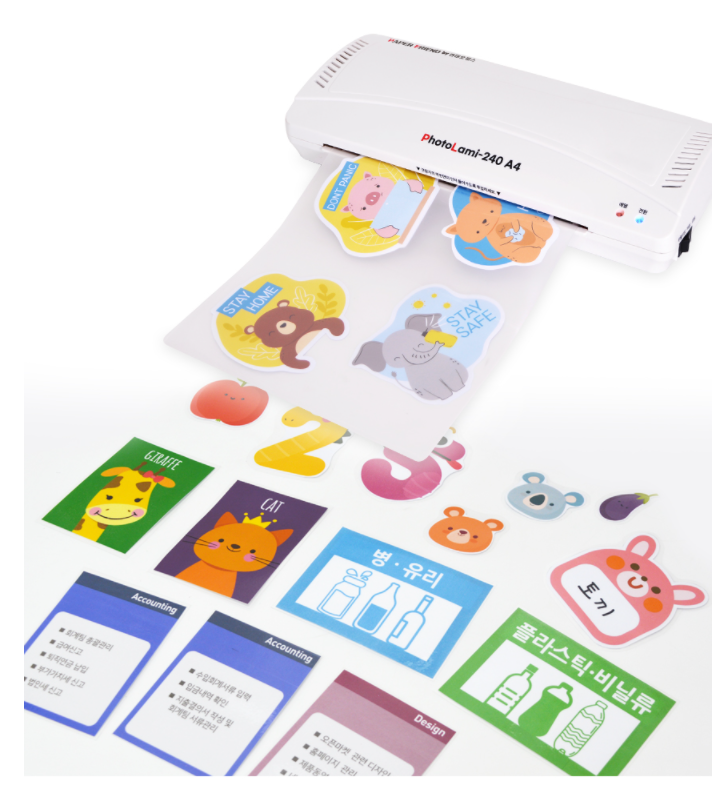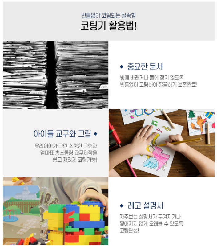 필자는 아이와 함께 집에서 낙엽으로 책깔피를 만들고 아이가 색칠한 그림중에 마음에 드는걸 코팅해보았다. 이밖에도 중요하거나 오래 보관할 종이서류를 코팅하거나 아이 홈스쿨링 교규제작에도 사용할 수 있겠다.