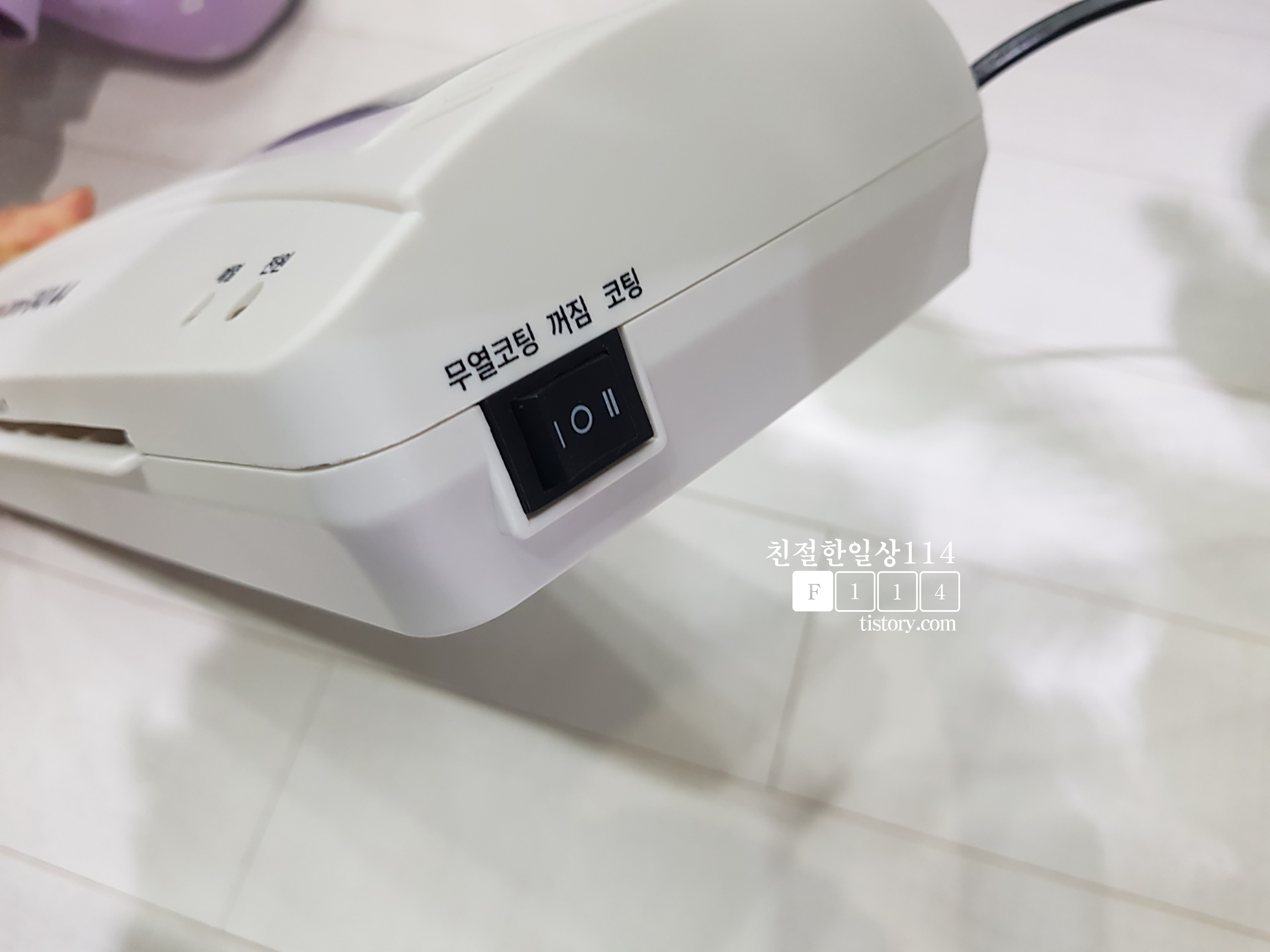 전원선을 코드에 꼽은 후 코팅기 옆면에 보면 무열코팅/꺼짐/코팅 이렇게 3가지 버튼이 있다. 처음에는 꺼짐으로 버튼이 되어있는데 이번에 배송받은 코팅지로 코팅을 할때는 '코팅' 쪽으로 버튼을 눌러주면 된다. 무열코팅은 접착력이 있는 손 코팅지로 특수코팅에 해당한다.