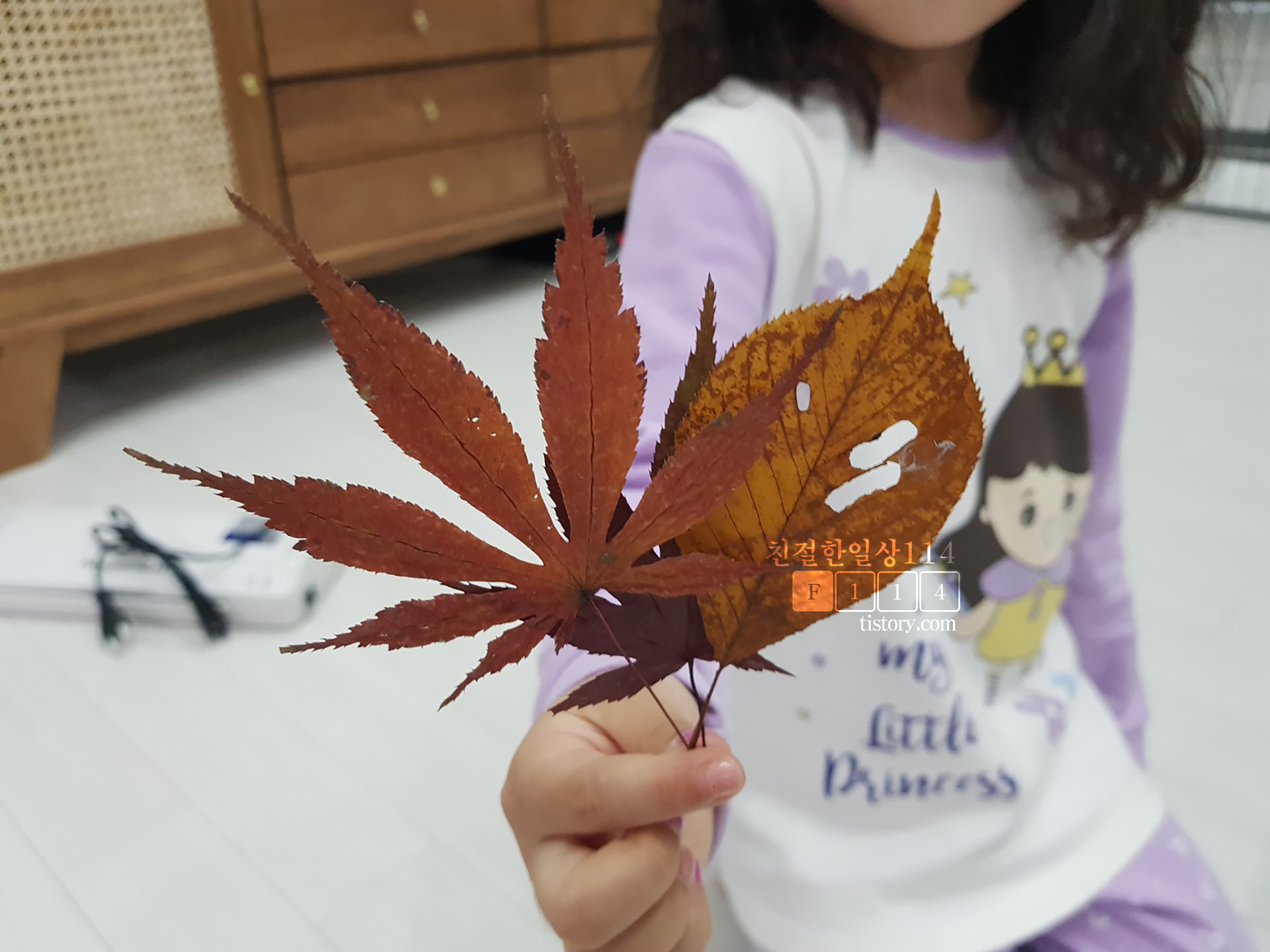 얼마전 산책하며 주워온 낙엽잎. 한글을 깨우치기 시작한 딸아이가 책읽는데 재미를 붙여서 낙엽잎 책깔피를 코팅해서 만들어 주기로 한다.