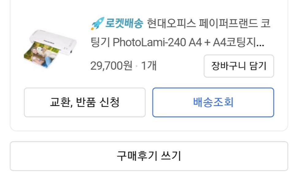 그래서 결정하게된 현대오피스의 가정용 코팅기 포토라미 PL-240 A4 코팅기 이다. 쿠팡을 통해서 29,700원에 구매했는데 인터넷 최저가를 보면 28,000원에 배송비 무료인 곳도 있다.