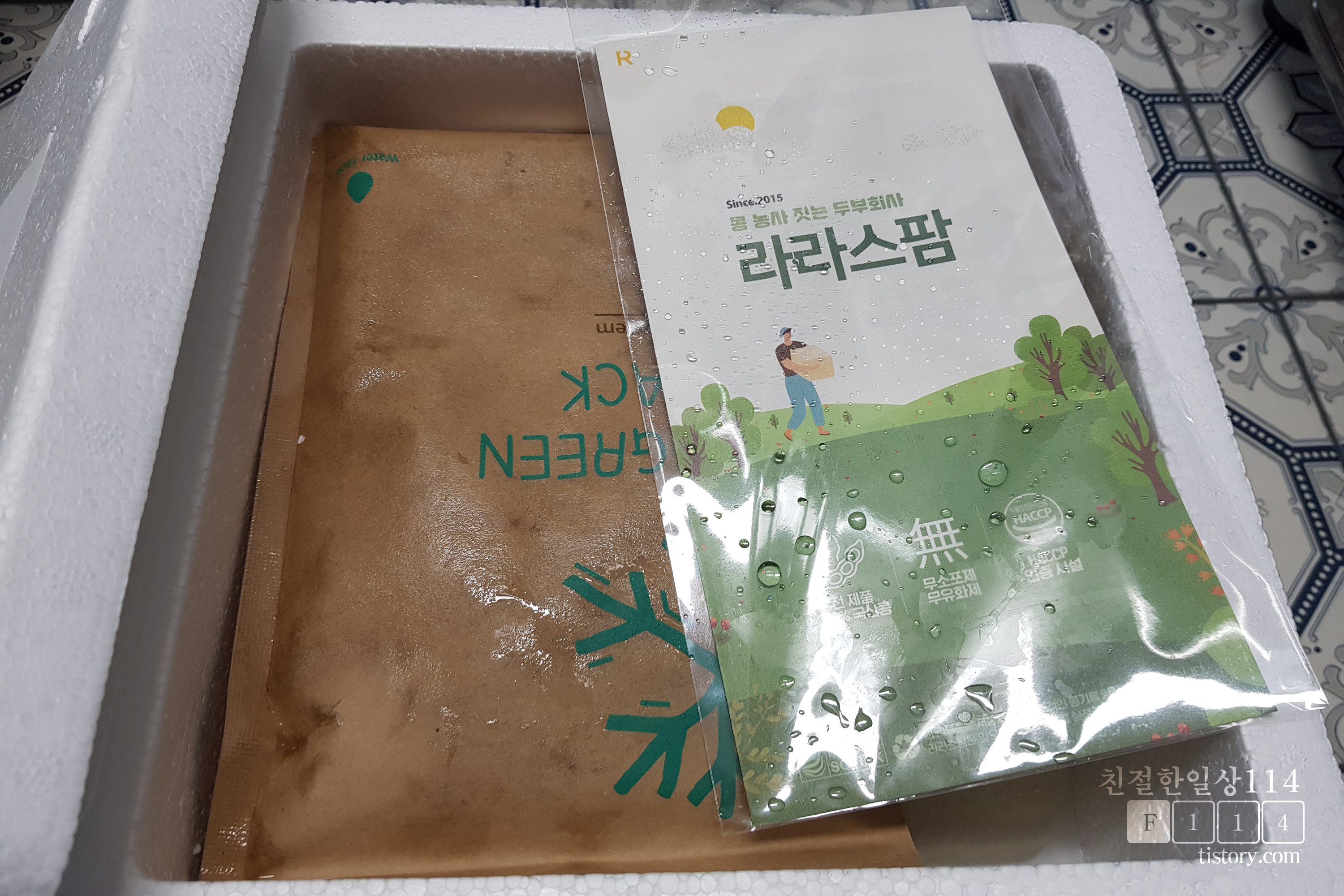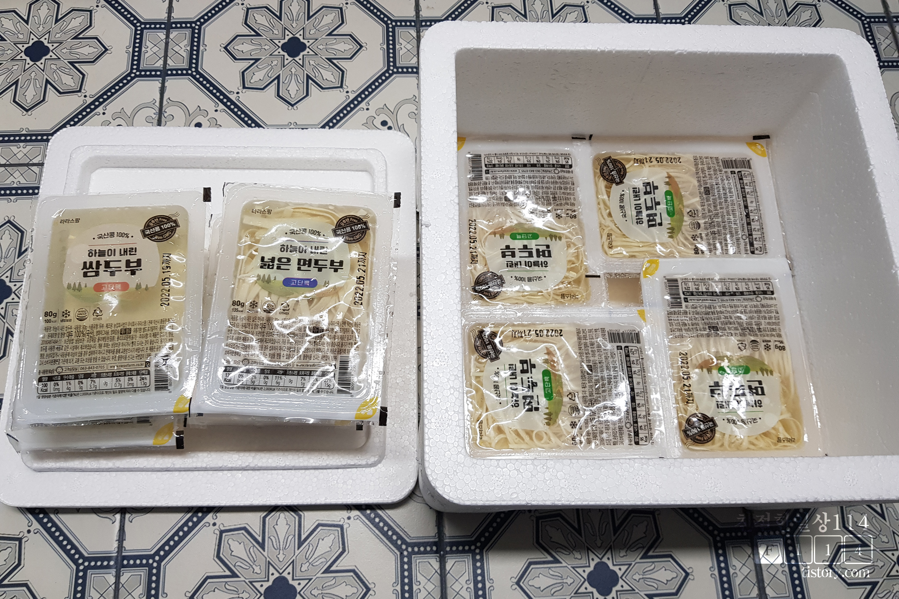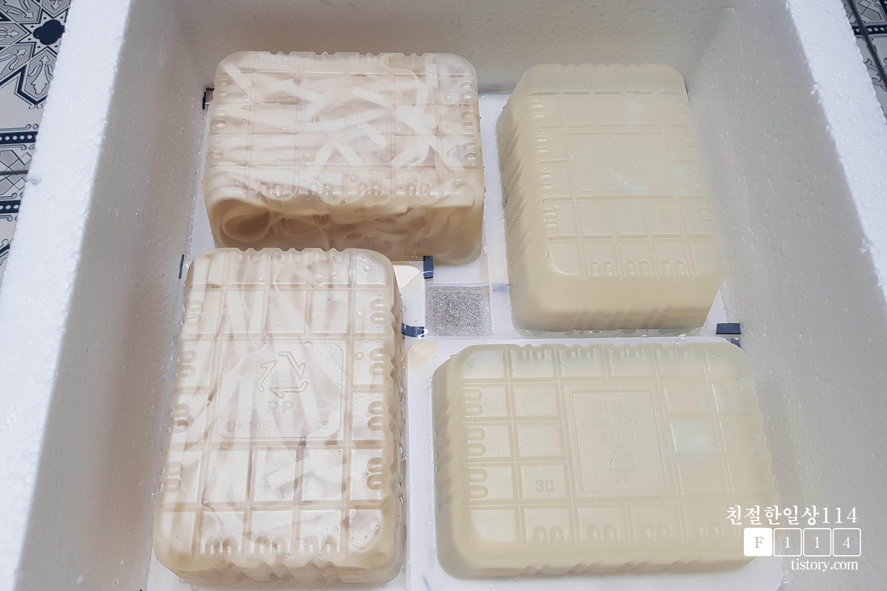 주문을 하면 아침에 발송된 제품을 당일에 받아 볼 수 있다. 스티로폼박스 안에 있는 두부제품이 흔들리지 않도록 아이스팩을 상자의 남는 공간에 채워 잘 포장이 되어 있었다.