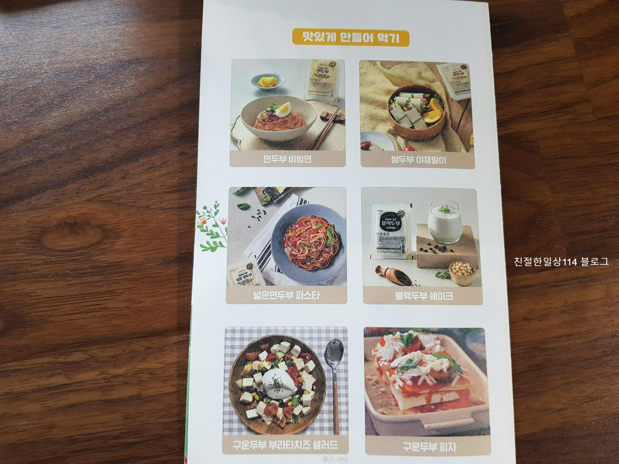 이색 두부제품으로 해 먹을 수 있는 메뉴가 동봉된 설명서에 들어있다. 얇은 면으로는 비빔면을 해먹 수 있고 넓은 면두부로는 파스타를 그리고 쌈두부로는 야채말이를 요리해 먹을 수 있다.