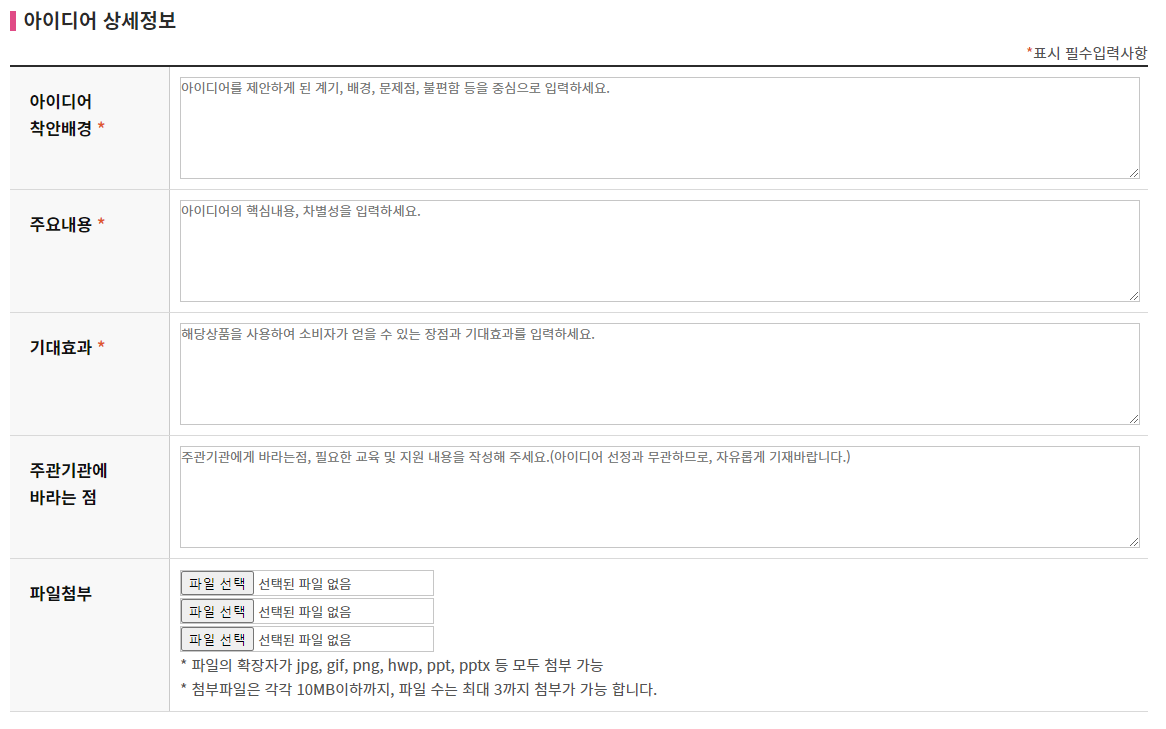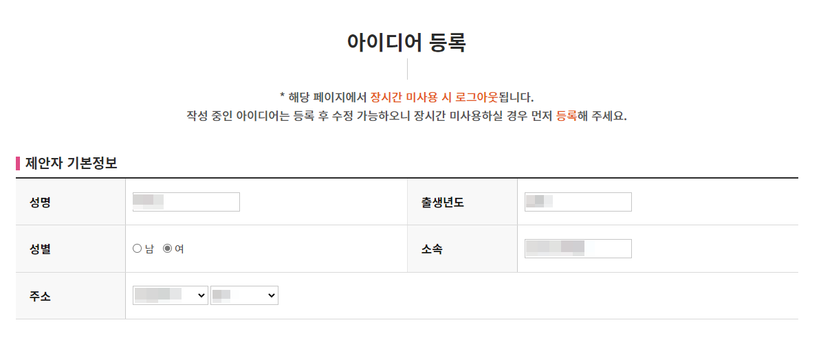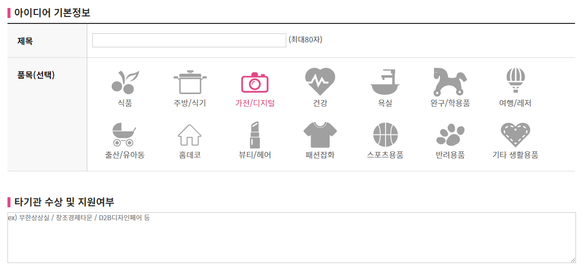 아이디어 제목을 최대 80자 이내로 작성하고 제안 아이디어가 어디에 해당하는지 품목을 선택한다. 그리고 타기관 수상 및 지원여부가 있다면 입력하도록 한다.