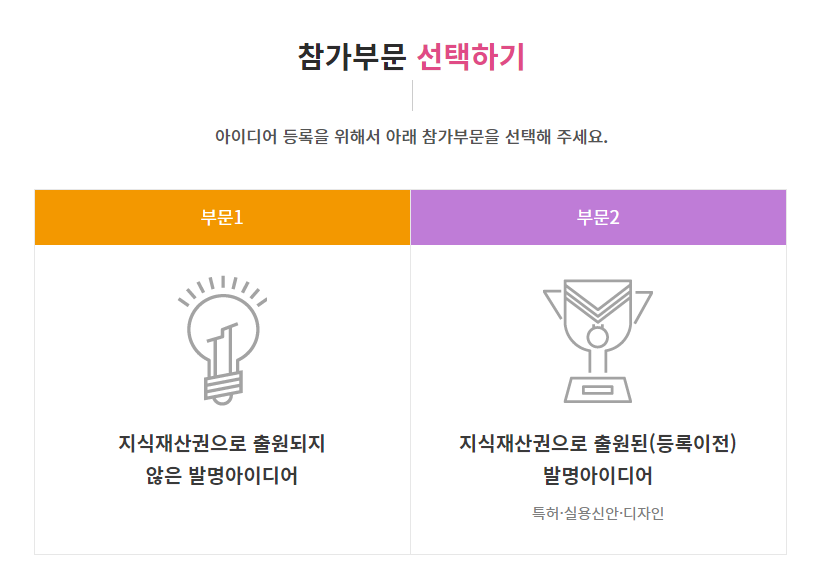 지식재산권으로 출원되지 않은 아이디어는 부문1, 지식재산권으로 출원된(등록이전) 아이디어는 부분2로 클릭해서 들어간다.