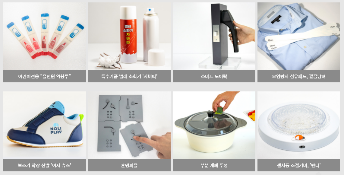 어떤것을 제안할지, 어떤 아이디어가 있을지 고민스러울 수 있어 작년에 수상한 아이디어를 올려본다. 어린이전용 약봉투와 부분 개폐 뚜껑 같은 경우에는 있으면 많이 편리할 것 같은 아이디어라서 보면서 진작에 있었으면 좋았을걸.. 이라는 생각도 하게 되었다.