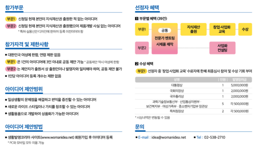 창의적 여성의 아이디어로 상품화가 가능한 생활발명을 발굴하고 특허 출원과 등록, 시제품 제작까지 지원하는 지식재산 기반 여성창업 촉진 사업으로 특허청과 한국여상발명협회에서 주관하고있다. 참가는 대한민국 여성이면 연령에 제한 없이 누구나 참가할 수 있고 아이디어 제안 범위는 일상 생활용품 부터 새로운 라이프 스타일이나 가치를 창조 할 수 있는 아이디어 등 폭넓게 두고 있다.