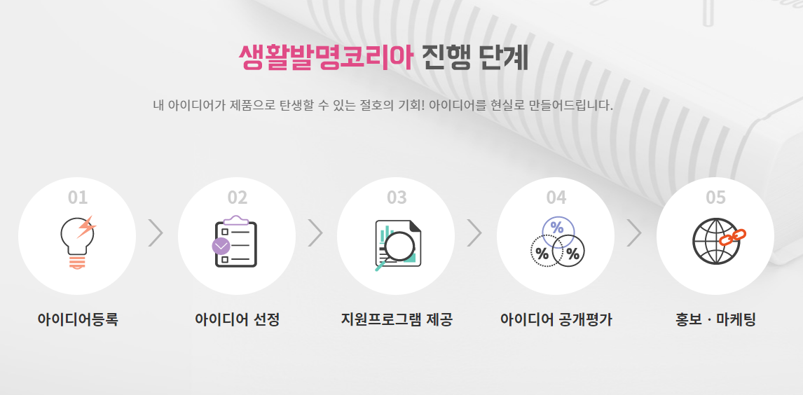 생활발명코리아 진행 단계를 보면 1. 아이디어등록 -> 2. 아이디어 선정 -> 3. 지원프로그램 제공 -> 4. 아이디어 공개평가 -> 5. 홍보, 마케팅 순서로 진행된다.