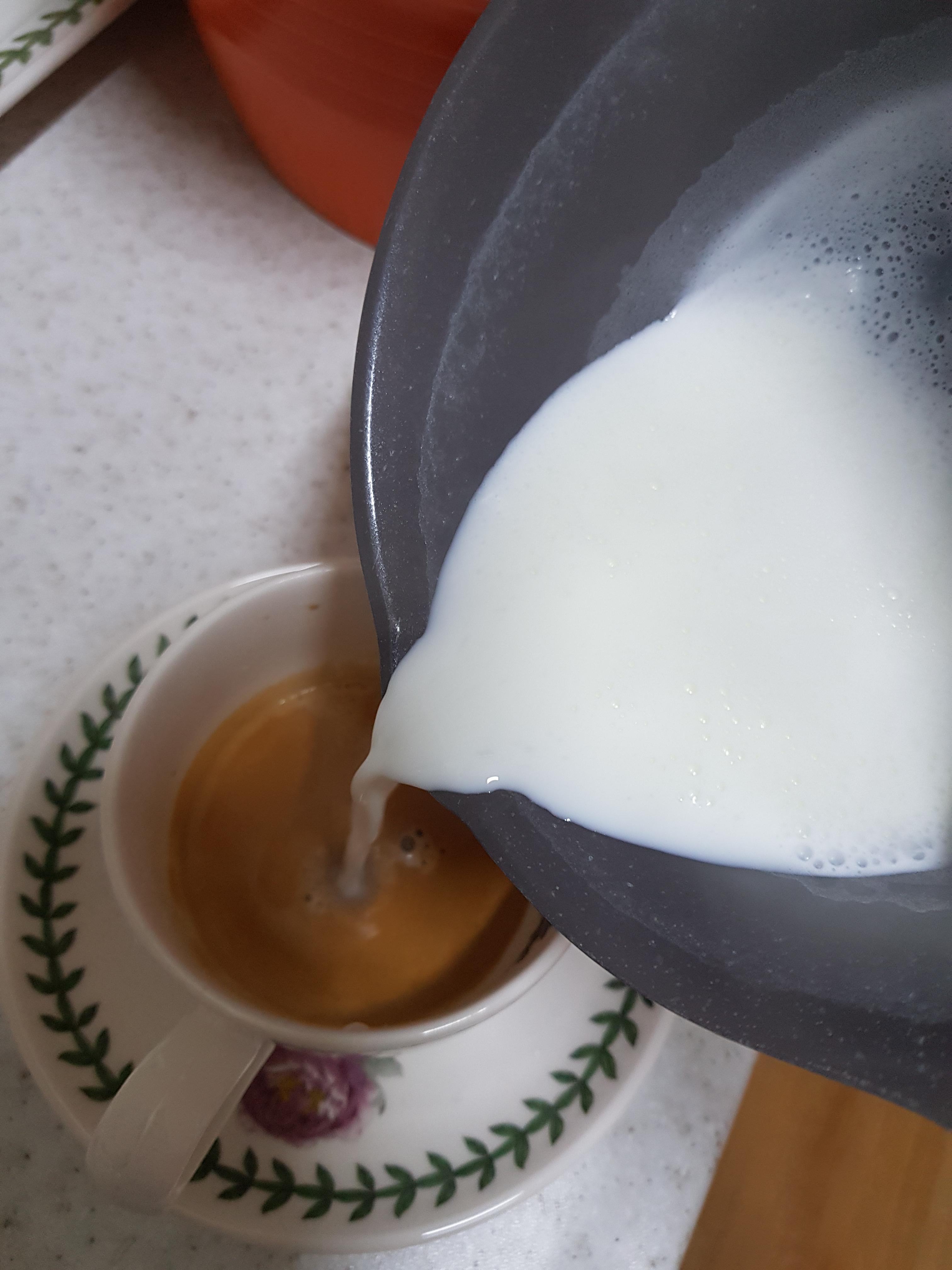 우유를 살짝 끓여서 거품이 올라오면 커피를 담아둔 잔에 넣는다. 거품기를 내면 더 부드러울테지만 이정도만 해도 썩 훌륭하다.