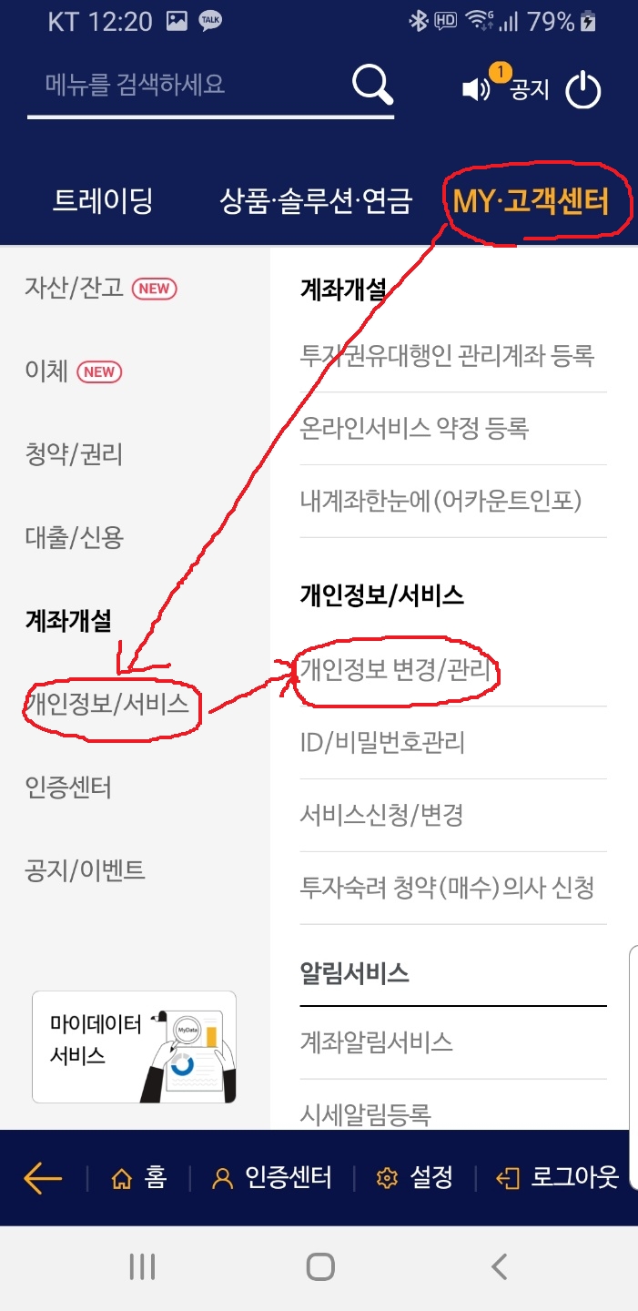 전체메뉴 -> MY고객센터 -> 개인정보/서비스 -> 개인정보 변경/관리