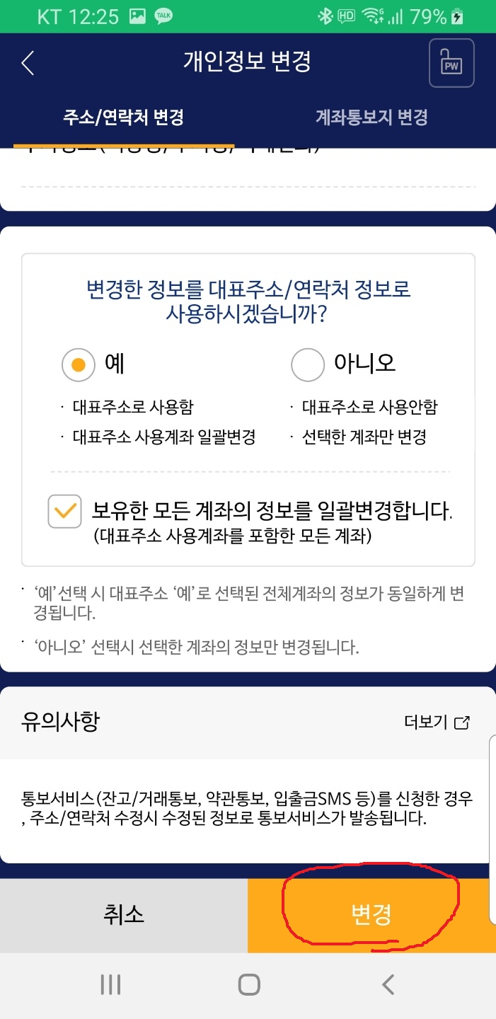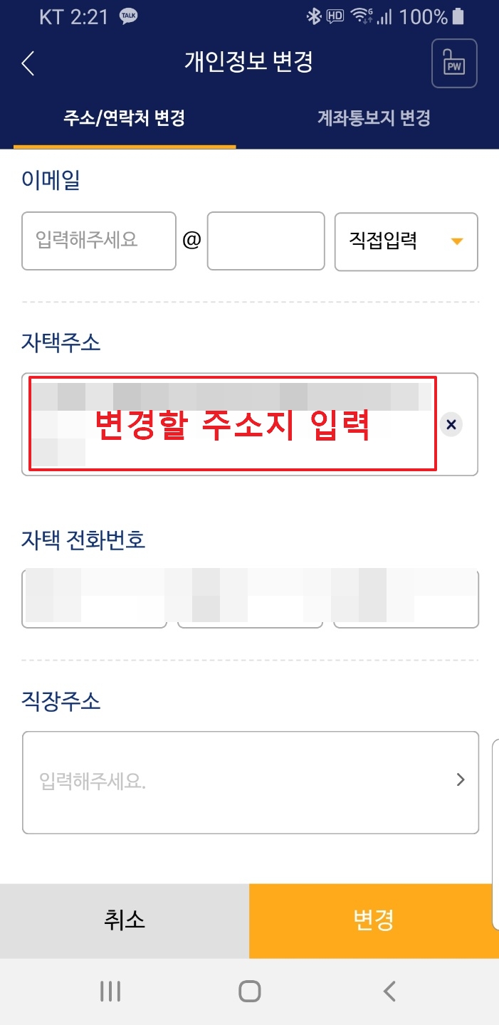 화면을 조금 내려보면 '자택주소' 칸이 나온다. 이곳에 현재 살고 있는 주소와 다르다면 변경할 주소지를 입력하고 아래로 내려가 '변경'을 터치 한다.