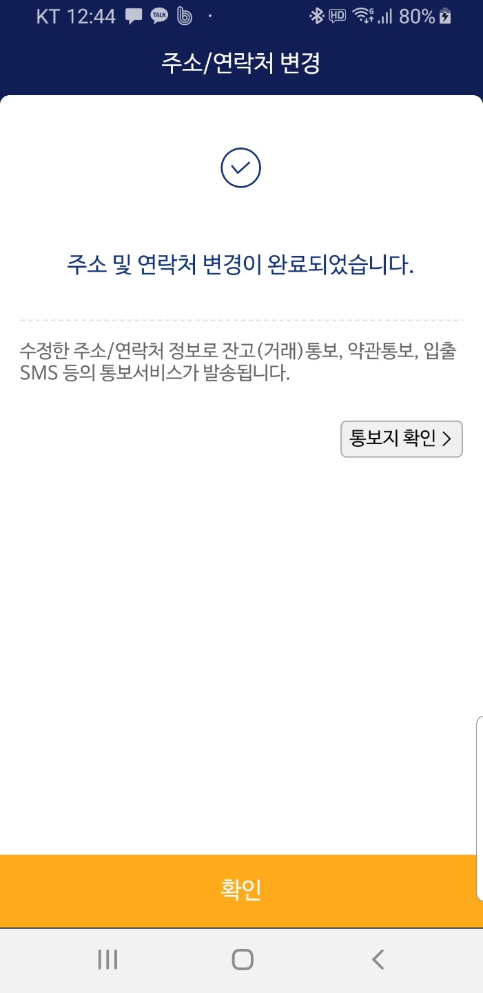 추가 인증 차례이다. 이 추가인증은 자녀계좌라서 하게 되는 것인지도 모른다. 자녀 계좌라서 자녀명의의 전화가 아니라 전화(ARS)로 인증을 하고서 주소 변경을 완료 할 수 있었다.
