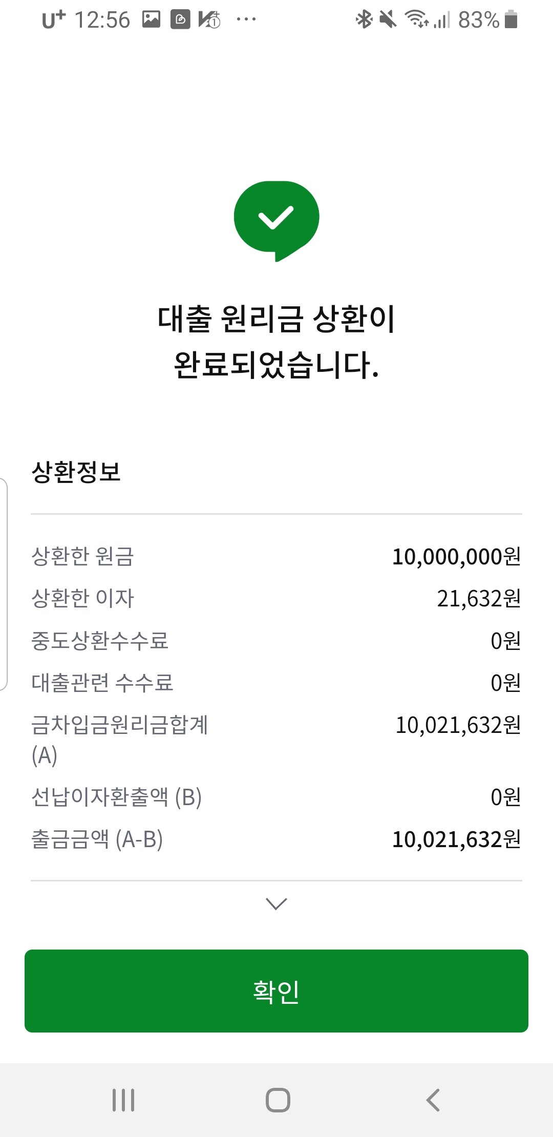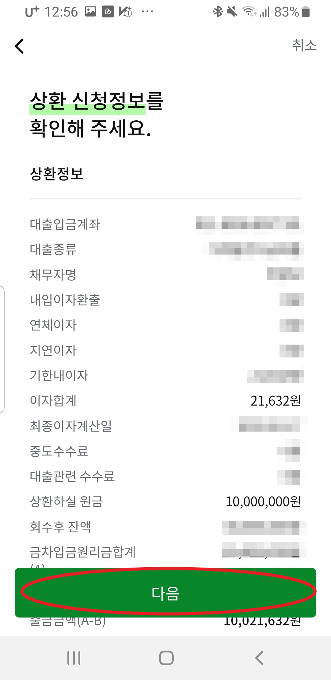 앞단계에서 상환할 금액을 입력하고 이번 순서로 넘어오게 되면 상환할 원금에 대한 이자가 자동 계산되어 나온다. 중도상환할때는 상환원금 + 이자를 함께 내야 한다.