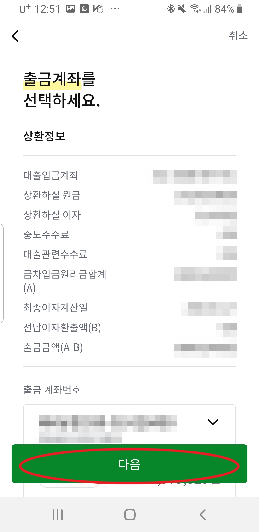 출금계좌를 선택하는 단계로 기존에 대출 이자가 빠져나가는 계좌가 자동으로 뜬다. 다른 계좌로 출금을 원한다면 추가로 계좌등록을 진행하면 된다.