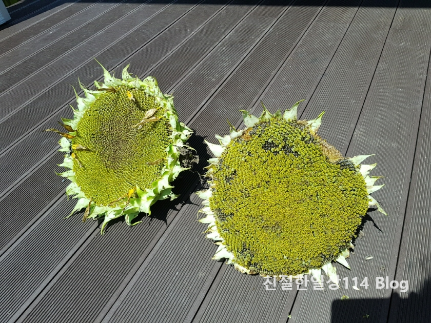 해바라기로씨로 기름도 짜먹고 볶아 먹기도 한다는데 기름을 짜기에는 양이 적기에 볶아먹기로 한다. 잘 자란 해바라기를 보고서는 이웃집에서 내년에 심게 씨앗을 나눠달라고 해서 넉넉히 나눠 드린다. 왕성하게 자라주었던 해바라기 자식들이 내년에도 잘자라 풍성하게 열매를 맺어주었으면 좋겠다.
