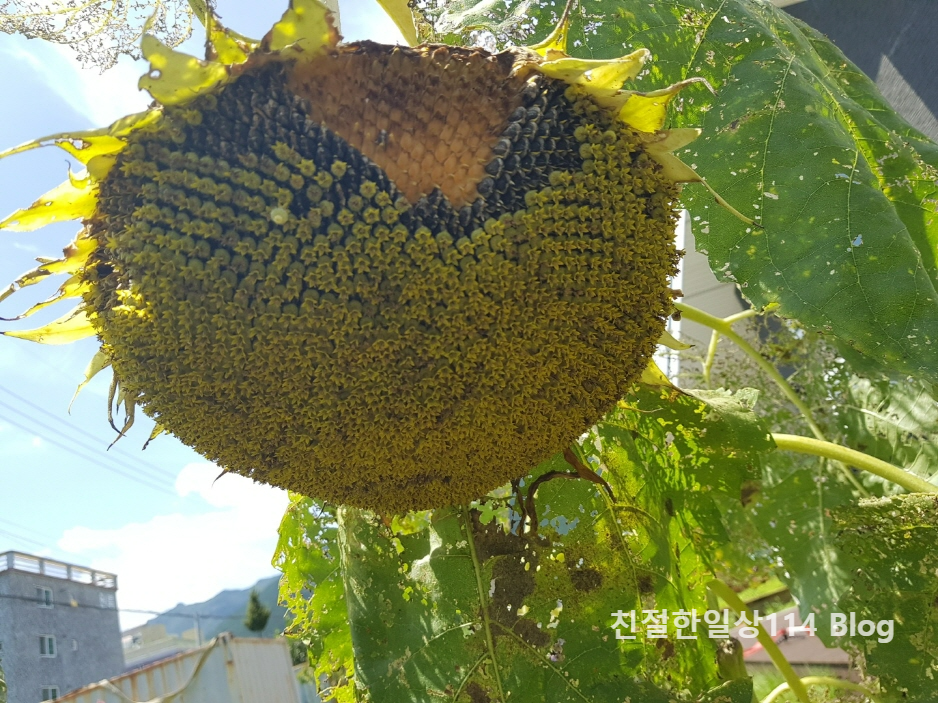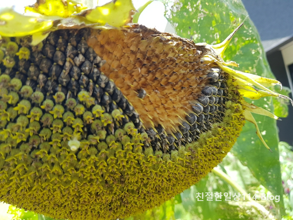 올 봄 다이소에 들렸다가 해바라기 씨를 판매중이것을 보고 한봉투 사와서 화단에 심었는데 싹이트고 꽃이피고 열매(씨)까지 맺었다. 성인 남자 키를 훌쩍 넘겨 자란 해바라기가 8월에 접어드니 꽃도 고개를 숙이고 잎도 시들해져 꽃을 따서 안을 열어보기로 한다.