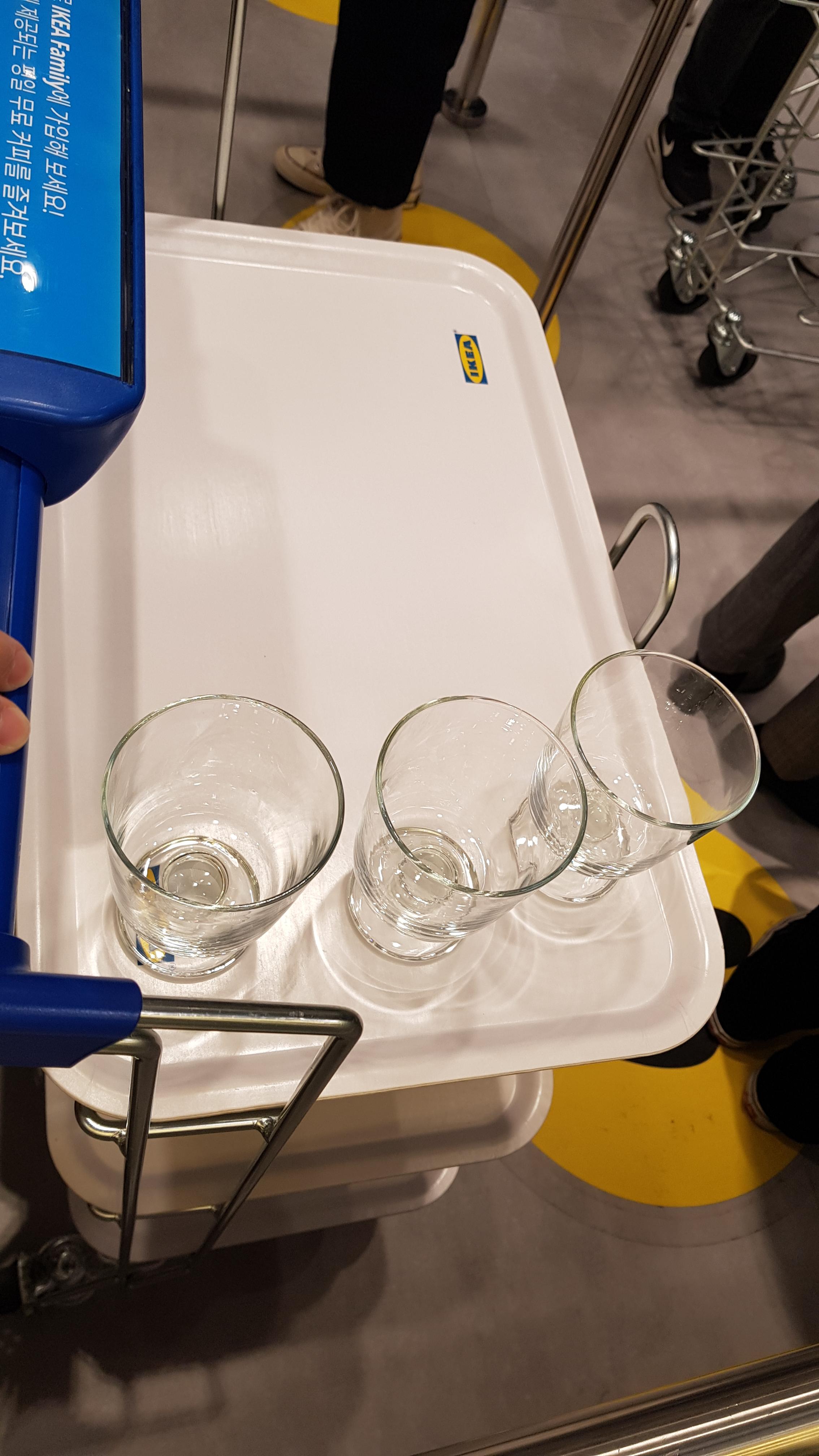 우리는 음료를 마실거라서 컵 음료컵 3개를 가져와 카트 쟁반에 올렸다.