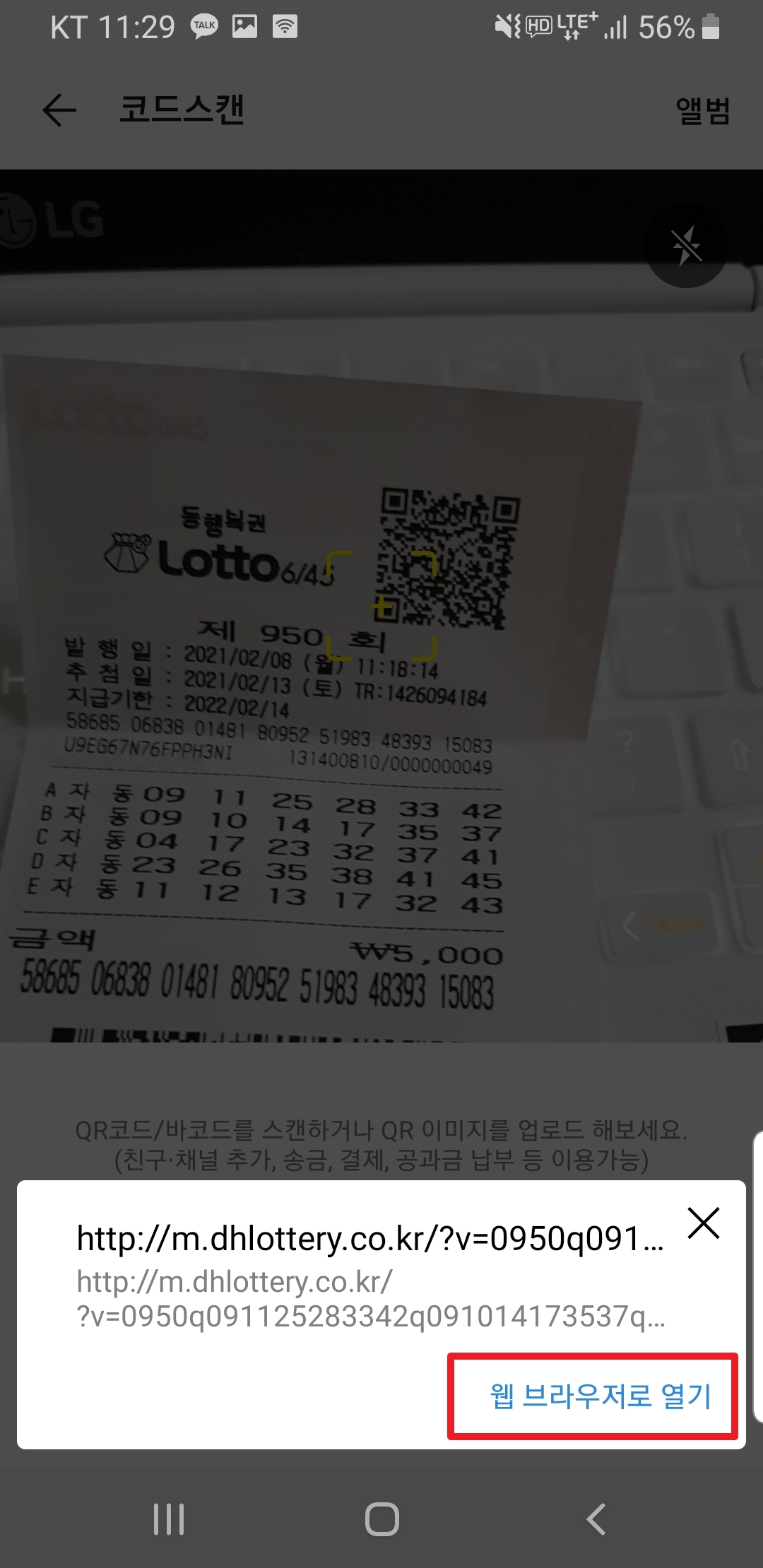 스캔이 되고나면 화면이 어두워지면서 아래쪽에 '웹 브라우저로 열기'가 나오면 클릭하면 동행복권 웹사이트로 연동되어 들어가진다.
