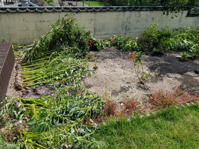 태풍의 강한 바람으로 인해 쓰러진 화단 식물들