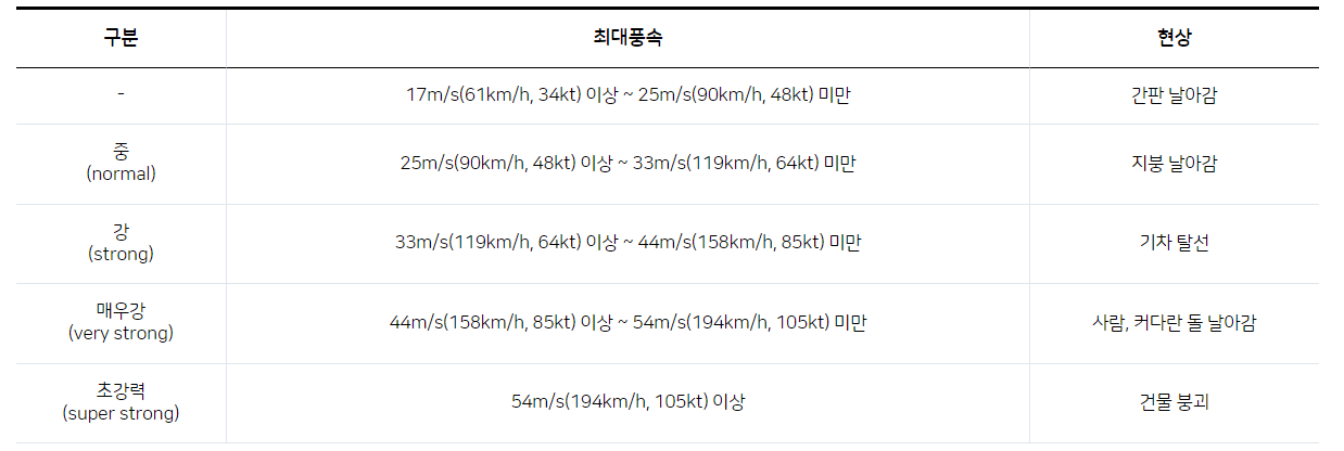 태풍 '강'의 세기면 최대풍속은 33m/s(119km/h,64kt) 이상 ~ 44m/s(158km/h,85kt) 미만으로 이는 기차가 탈선될 정도의 바람이다.