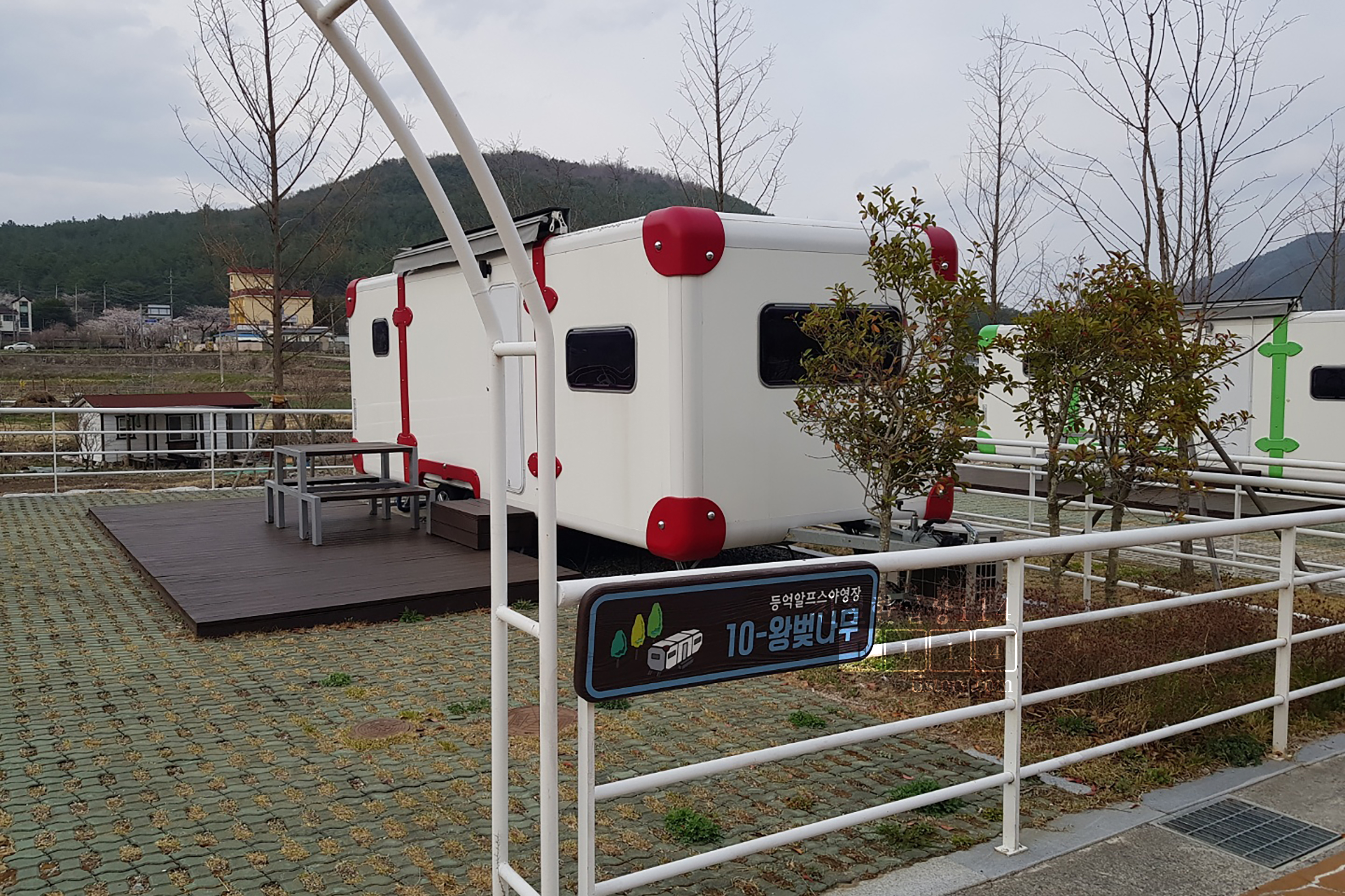 카라반 바로 옆에 주차를 할 수 있는 주차장이 있고 그 뒤쪽으로 야외 테이블이 데크위에 있다.