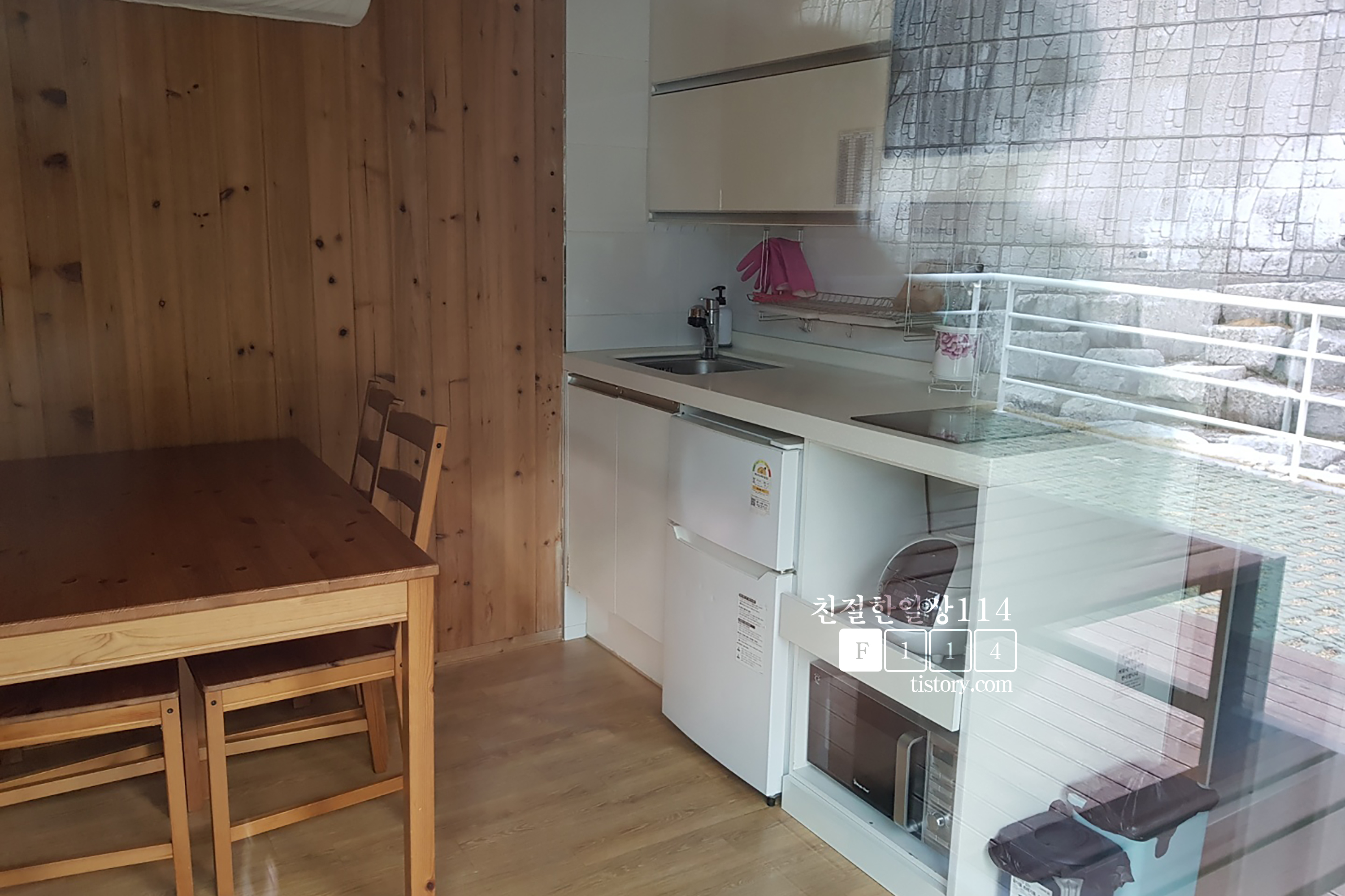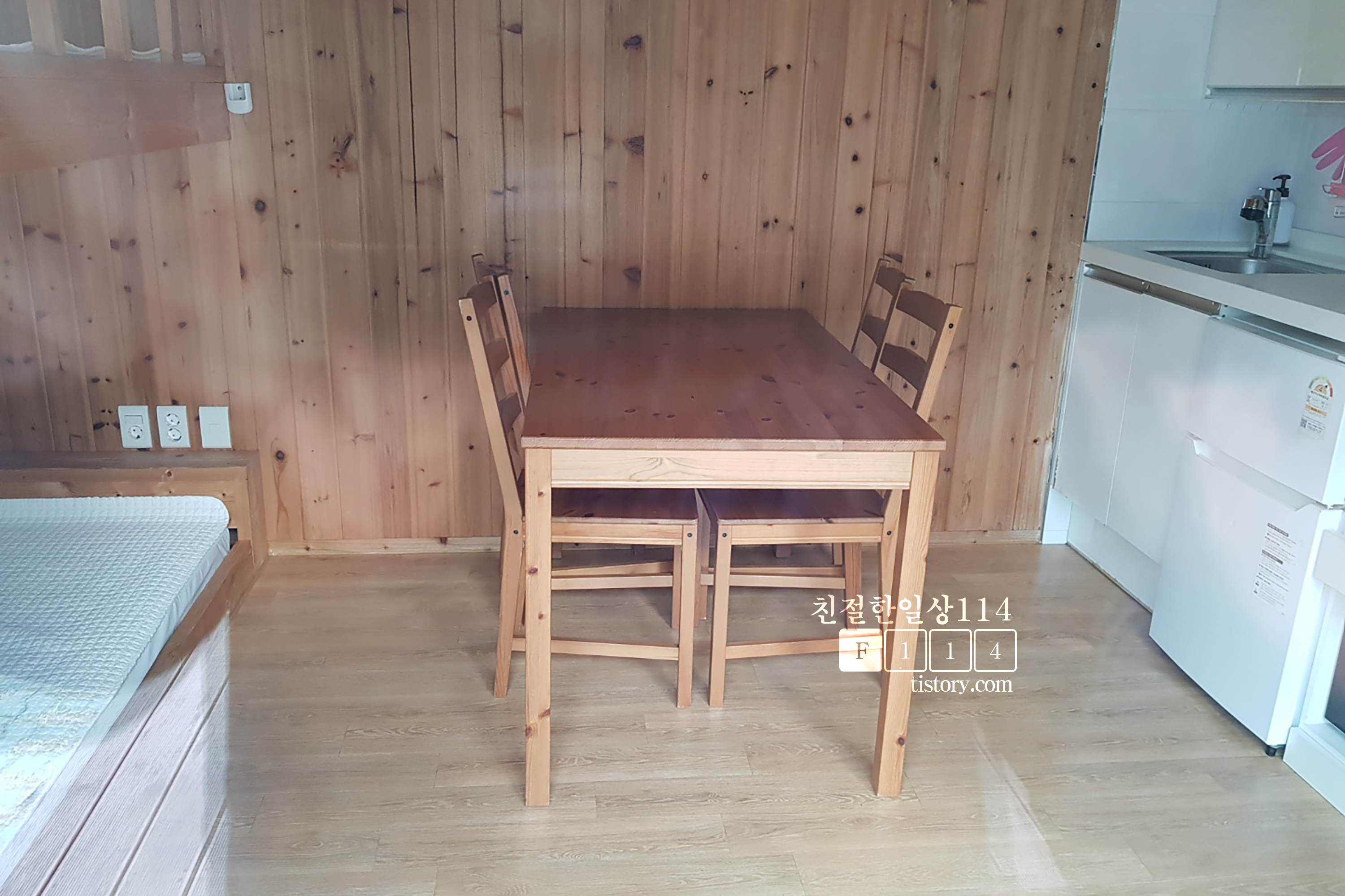 사람이 없어서 곤충카라반 안을 살짝 들여다 보았다. 중앙에 식탁이 있고 한쪽으로 주방, 반대쪽으로 2층 침대가 있다. 곤충카라반은 정원이 6명이며 최대 8인까지 숙박할 수 있다고 되어있는데 안을 보니 8명까지는 많이 좁을 것 같다는 생각이 들었다.