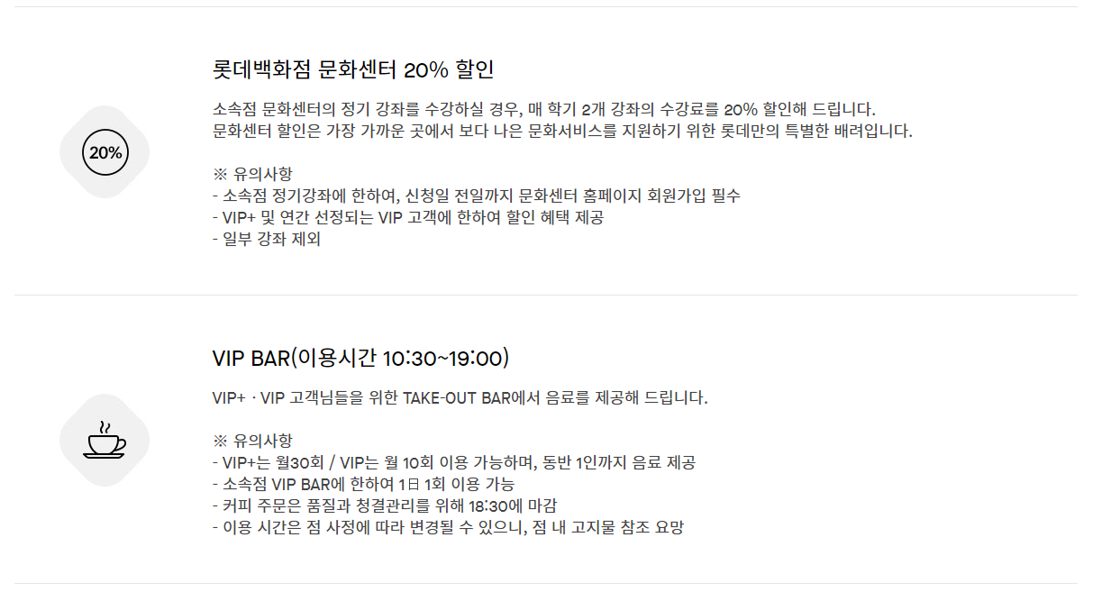 문화센터 20% 할인 제공, 문화센터를 잘 이용한다면 좋은 혜택이나 이용해본적이 없는 필자에겐 실용적이진 않다. 요즘 잘 이용하고 있는 VIP BAR 음료제공 서비스는 매우 좋다. VIP+는 월 30회 1일 1회 이용 가능하며 동반 1인까지 무료 제공된다.