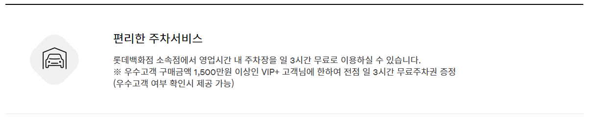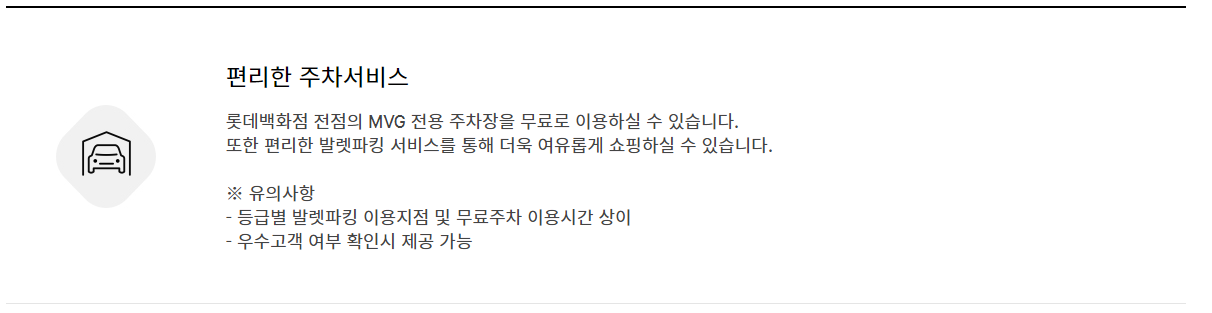 롯데백화점 MVG 전용 주차장을 무료로 이용할 수 있다. 여기에는 발렛 파킹 서비스가 포함된다.