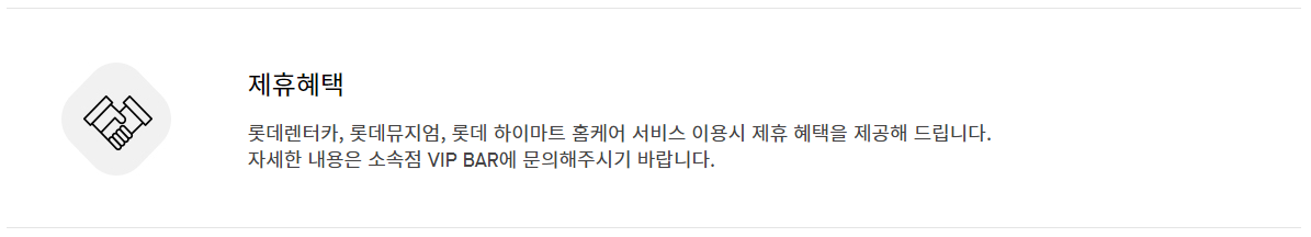 다른 롯데 계열사 이용시 할인등의 혜택이 주어진다. 이건 할인율이 클것같지 않고 별로 이용할 것 같지 않은 혜택이다.