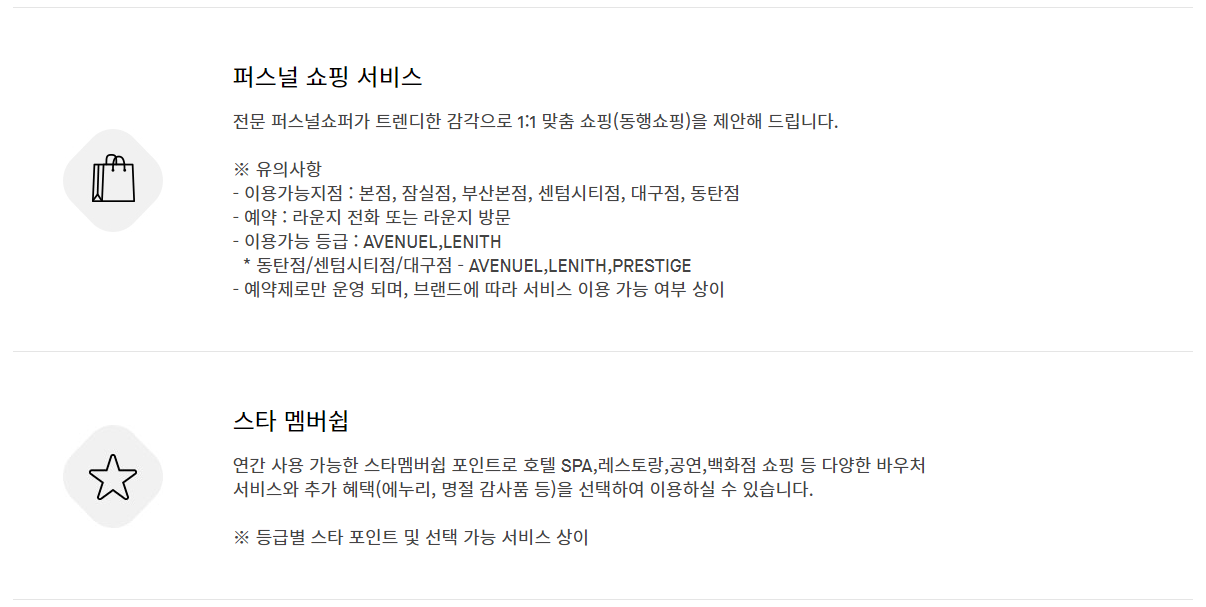 퍼스널 쇼핑서비스라고 하는데 한명이 밀착해서 쇼핑을 도와주는건가? 매장에 갔을때 직원이 따라붙으면 부담스럽던데 그런 느낌일까 모르겠다. 그외 바우처 서비스와 기념일 추하선물 등이 제공된다.