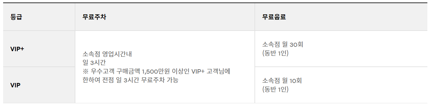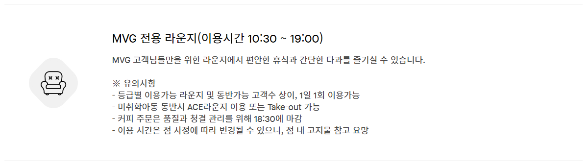 [MVG] 우수고객에게 제공되는 라운지와 발렛 서비스가 없다. 대신 소속점 일 3시간 무료주차와 무료 음료 서비스가 제공된다.