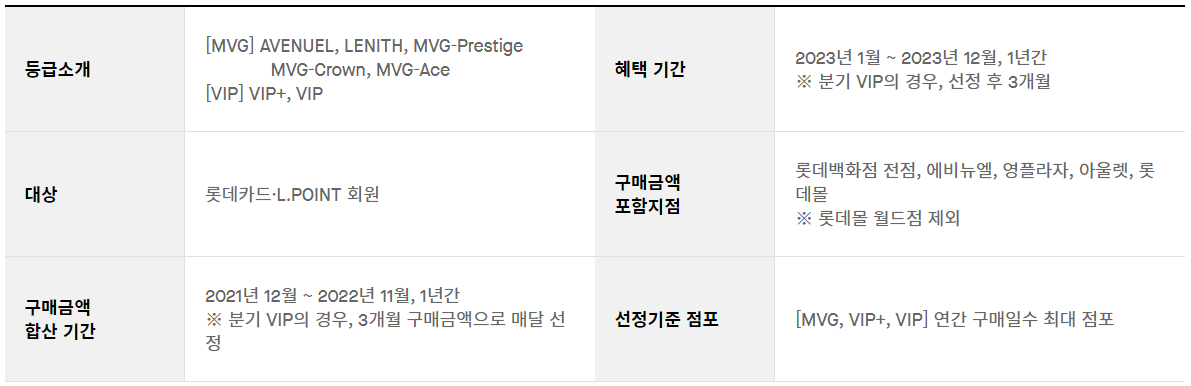 롯데백화점에서 우수고객이라 함은 롯데백화점과 롯데몰, 영플라자 등에서 1년간 구매한 금액이 일정금액이 되면 선정된다. 등급은 편의상 [VIP] 와 [MVG] 두 그룹으로 나눌 수 있고 이 속에서 또 세분화 된다. 좀 더 자세한건 아래표를 참고하자.