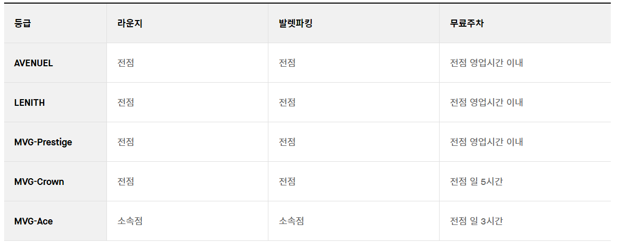 MVG 등급부터는 MVG 라운지와 발렛파킹 서비스가 제공이 된다. 등급별로 롯데백화점 전점에서 이용이 가능한지와 소속점에서 이용이 가능한지 나뉘게 된다. 아래에 어떤 서비스가 제공되는지 보도록 하자.