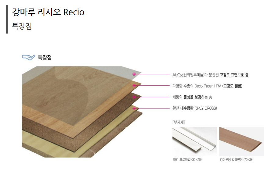 | 장점 | - 강마루에 비해 상대적으로 시공가격이 저렴하다. - 강도가 높아서 큰 하중을 견뎌내고 충격에 강하다. - 시공시 접착제나 본드를 사용하지 않아서 친환경적이고 인체에 무해하다. - 표면 필름 처리로 인해 오염시 제거가 쉽다. |