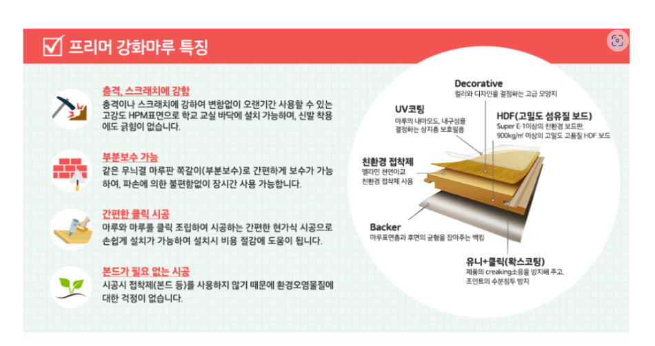 - 본드를 사용하지 않고 강화마루 재료끼리 끼워맞추기로 시공하기 때문에 걷을 때 소음이 발생할 수 있다. (층간소음 발생율 높음)