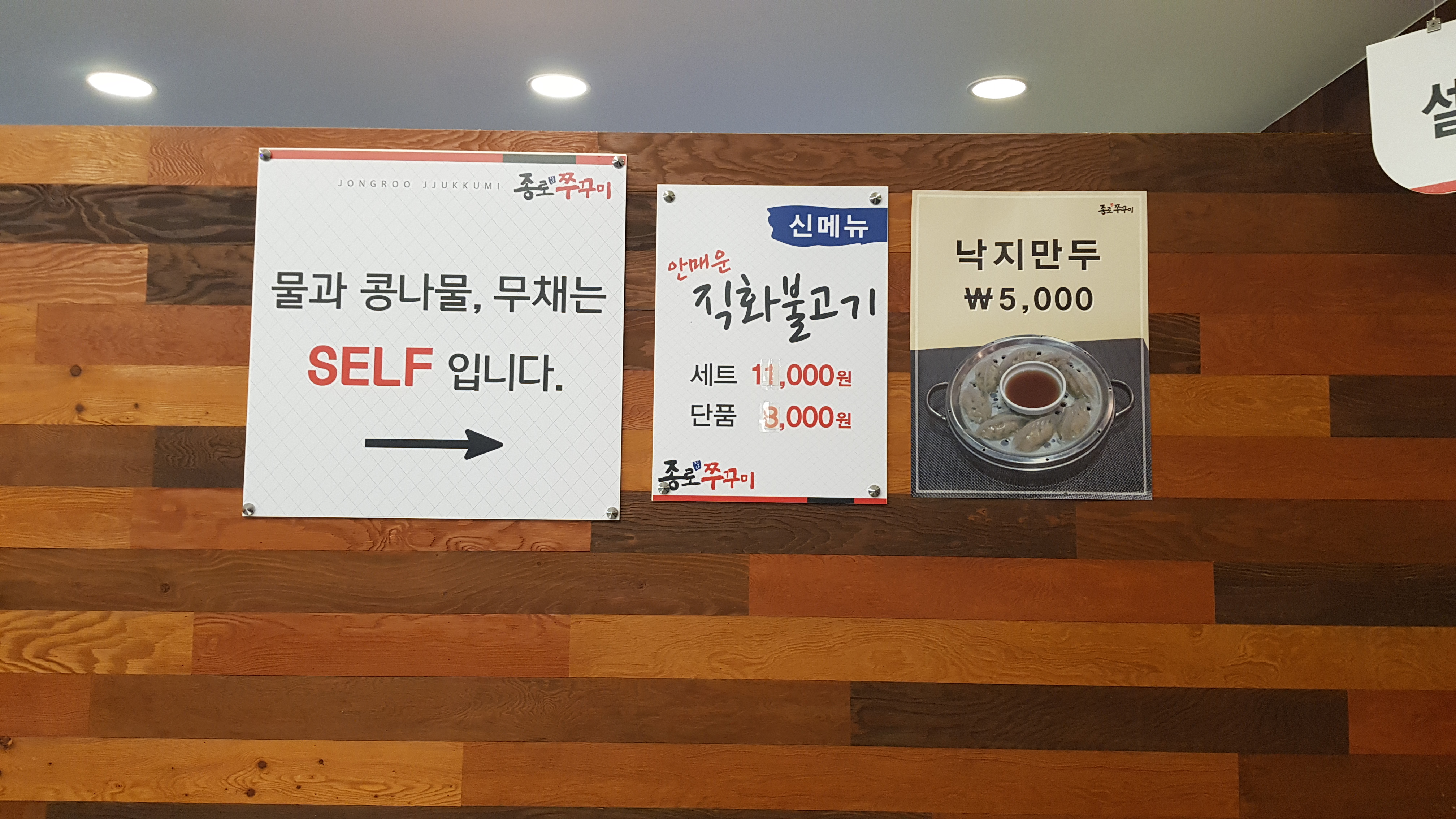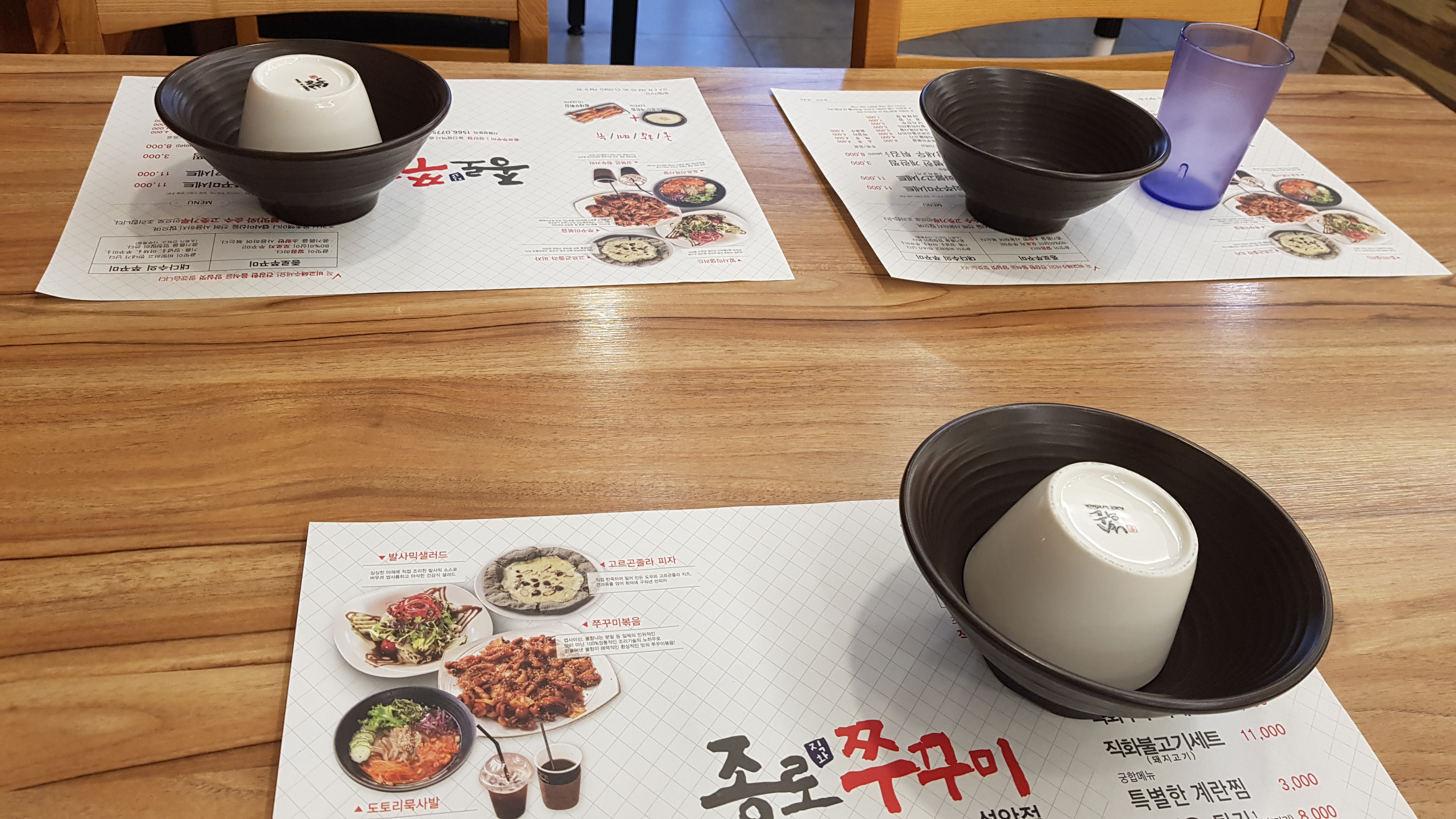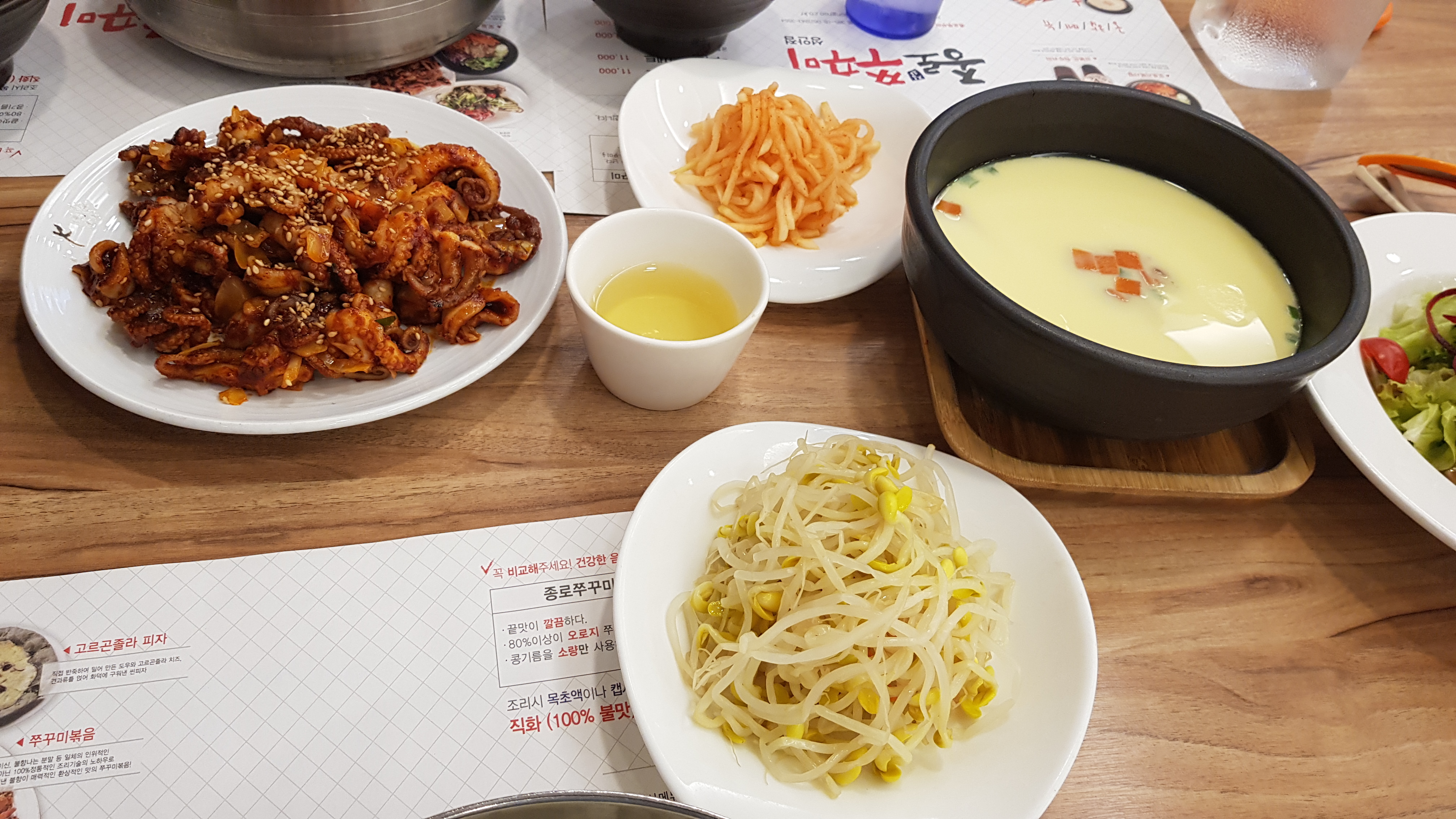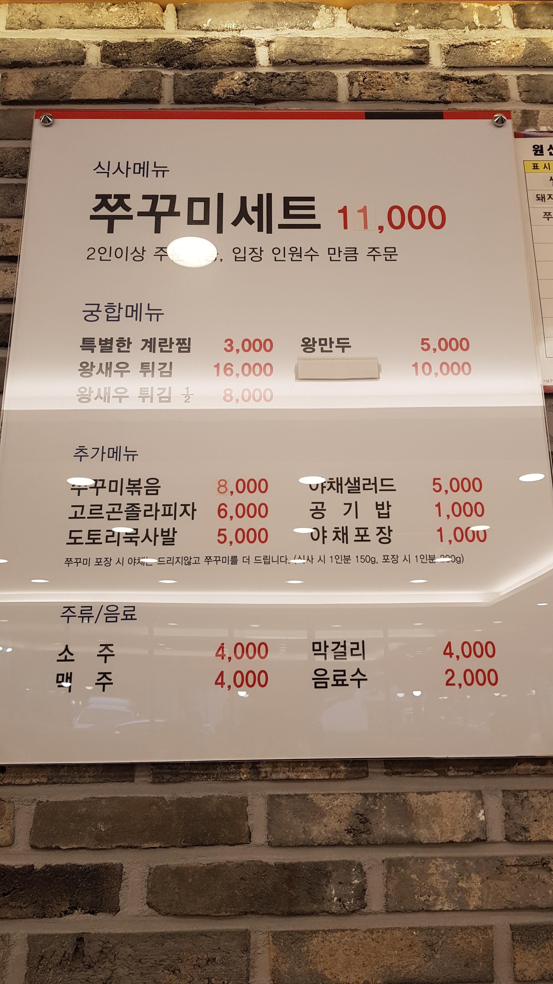 식당에 들어가서 자리에 앉아으면 메뉴판을 따로 가져다주지는 않는다. 조금만 눈을 돌리면 벽에 걸려있는 메뉴판과 테이블에 깔려있는 종이에서 메뉴를 쉽게 볼 수가 있다. 대표메뉴는 쭈꾸미세트로 쭈꾸미볶음+고르곤졸라 피자+발사믹샐러드+도토리묵사발+원두커피 이렇게 포함되어 있다. 식사 무료커피는 세트주문시에만 가능하다.