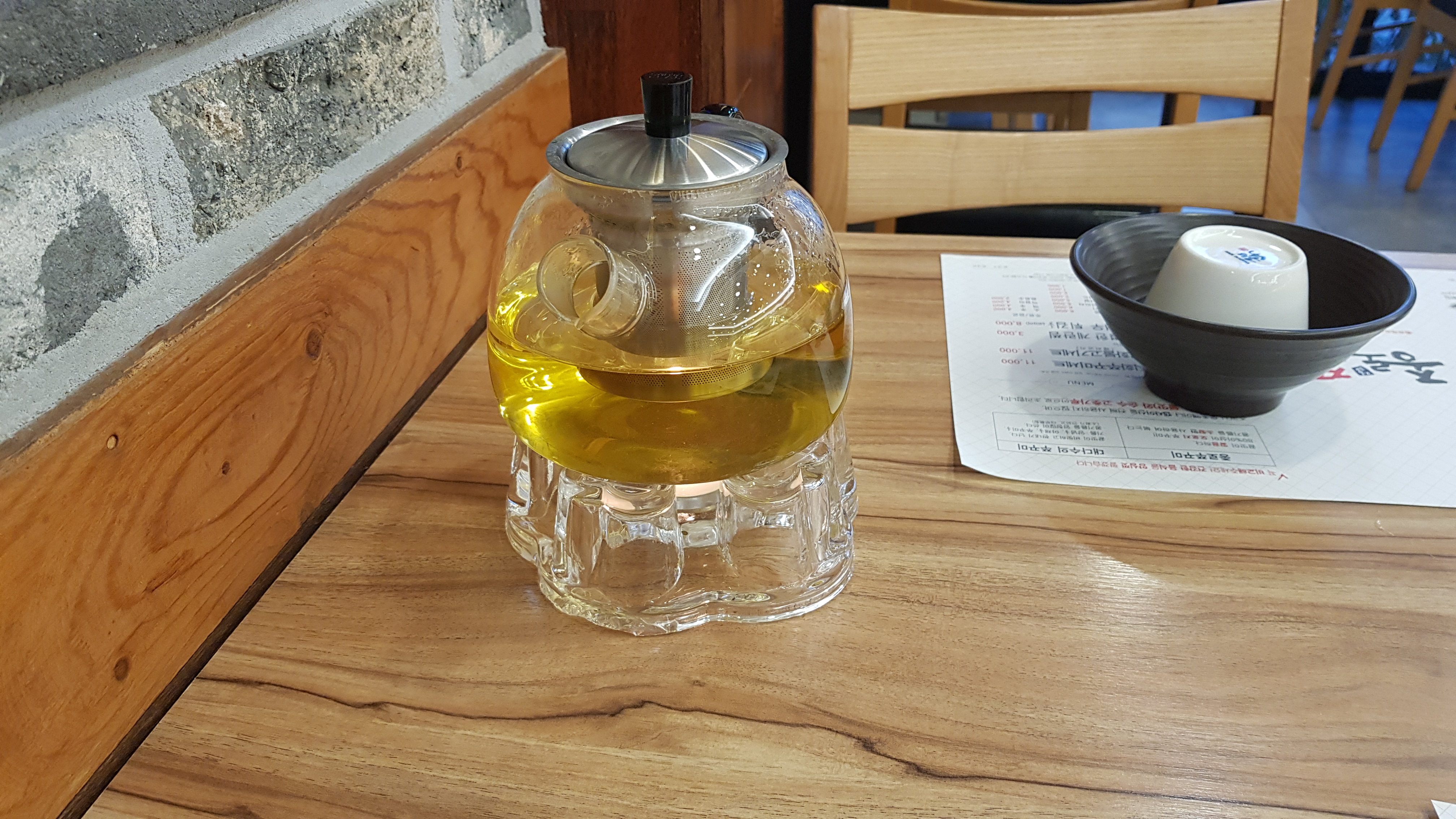 음식이 나오기전에 먼저 투명한 주전에 차를 담아서 준다. 아래에 초를 켜두어 식사를 다 할때까지도 차를 따뜻하게 마실 수가 있다.