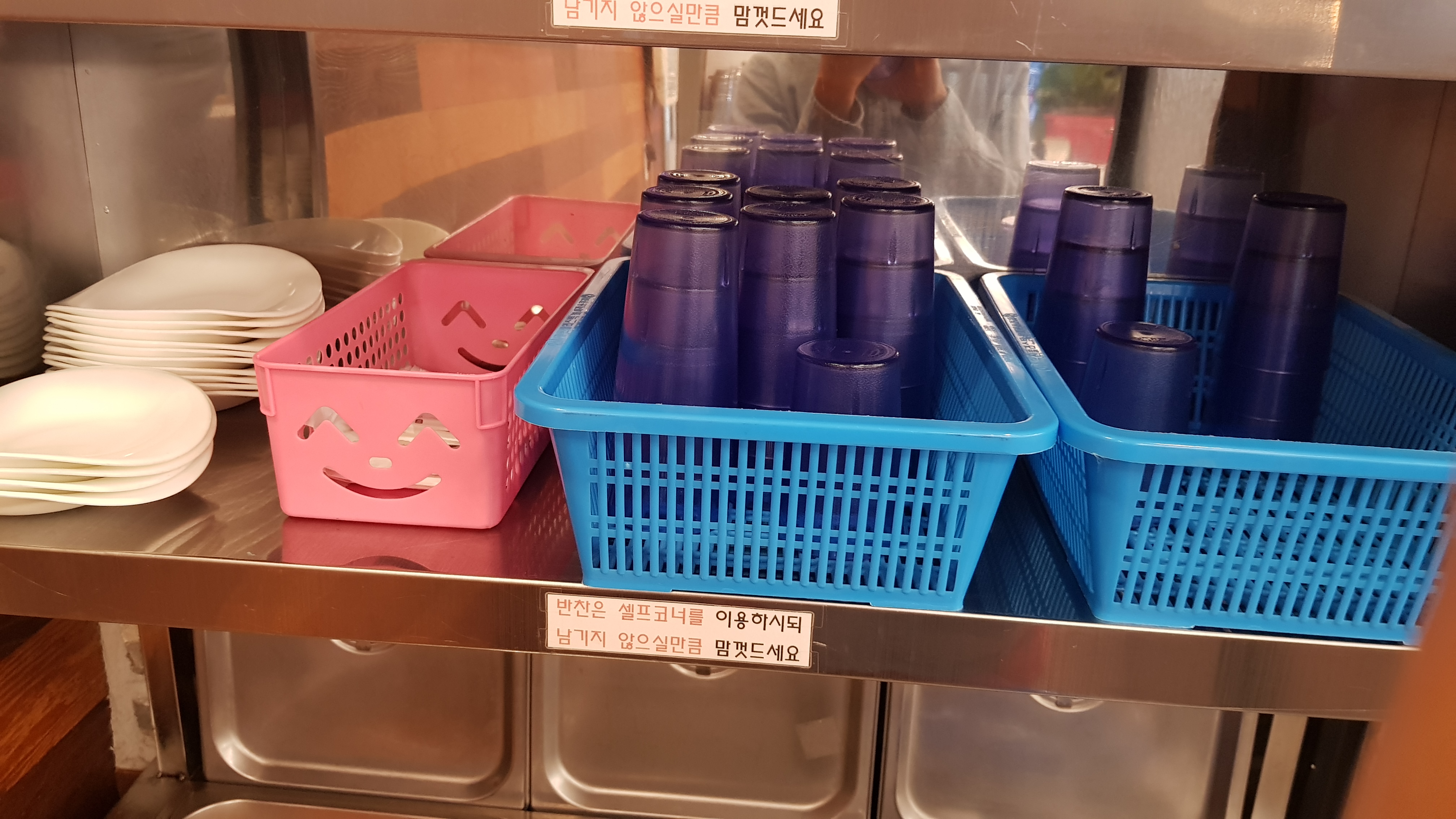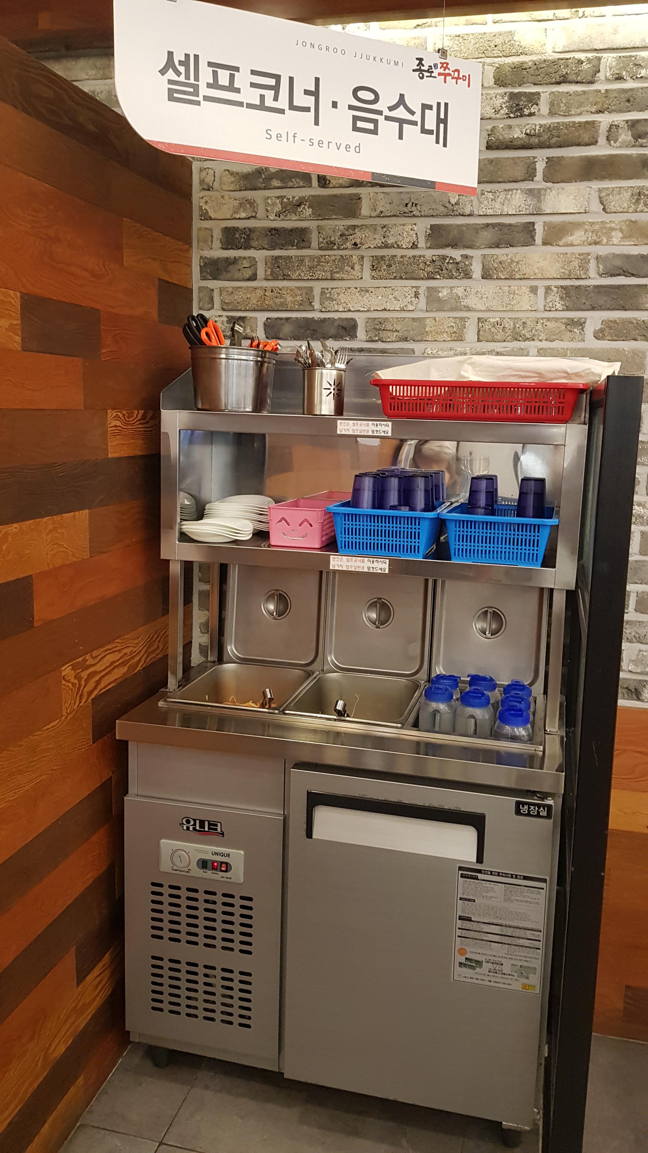 카운터 오른쪽으로 셀프코너가 마련되어 있다. 테이블에 차는 서빙해주지만 물은 주지 않는다. 물은 셀프코너에 가면 물이 담긴 병과 컵을 가져와서 마시면 된다.