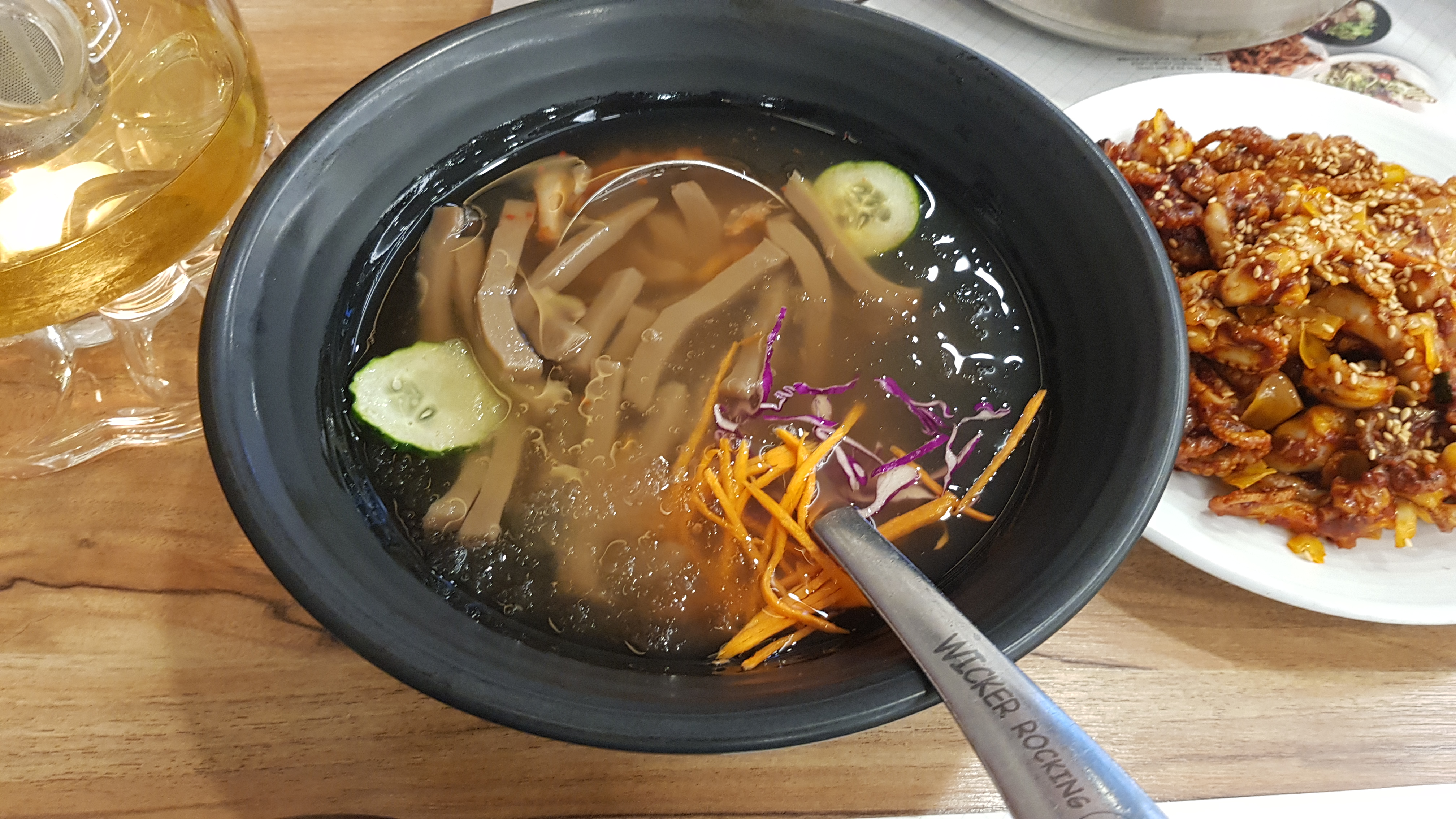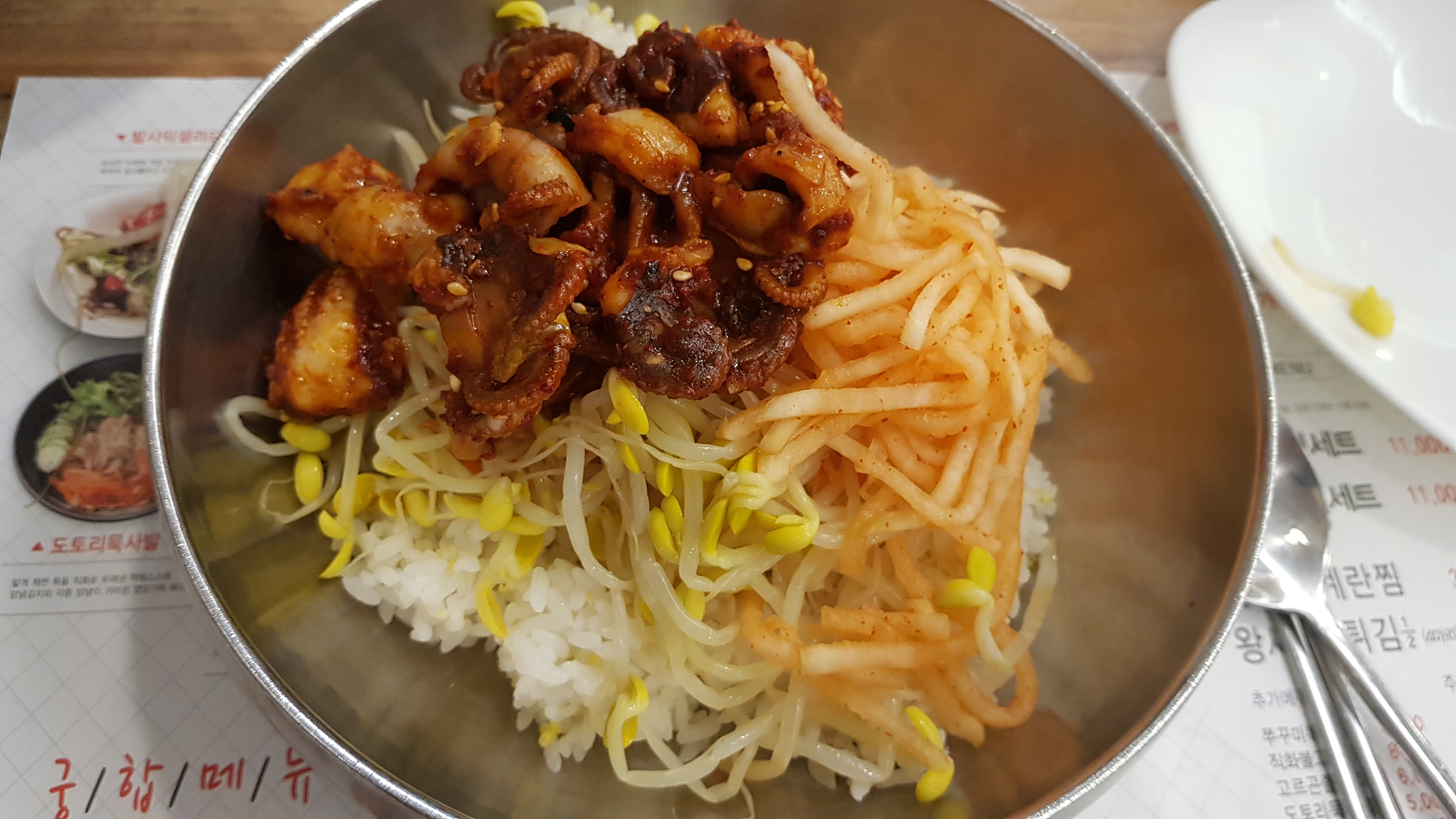 도토리 묵사발. 살얼음과 함께 나와 매우 시원하고 새콤한 맛이 난다. 쭈꾸미를 먹으며 달궈진 입안을 한번씩 식혀가며 먹기에 딱 좋다. 매운 쭈꾸미와 도토리 묵사발은 환상적인 궁합이다.