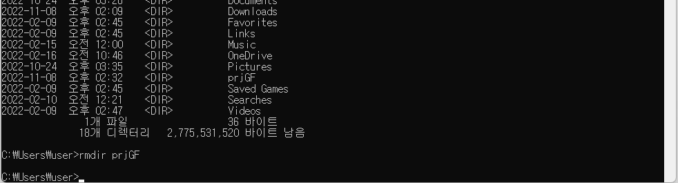 명령 프롬프트창에 'rmdir prjGF'라고 입력하고 엔터를 친다.