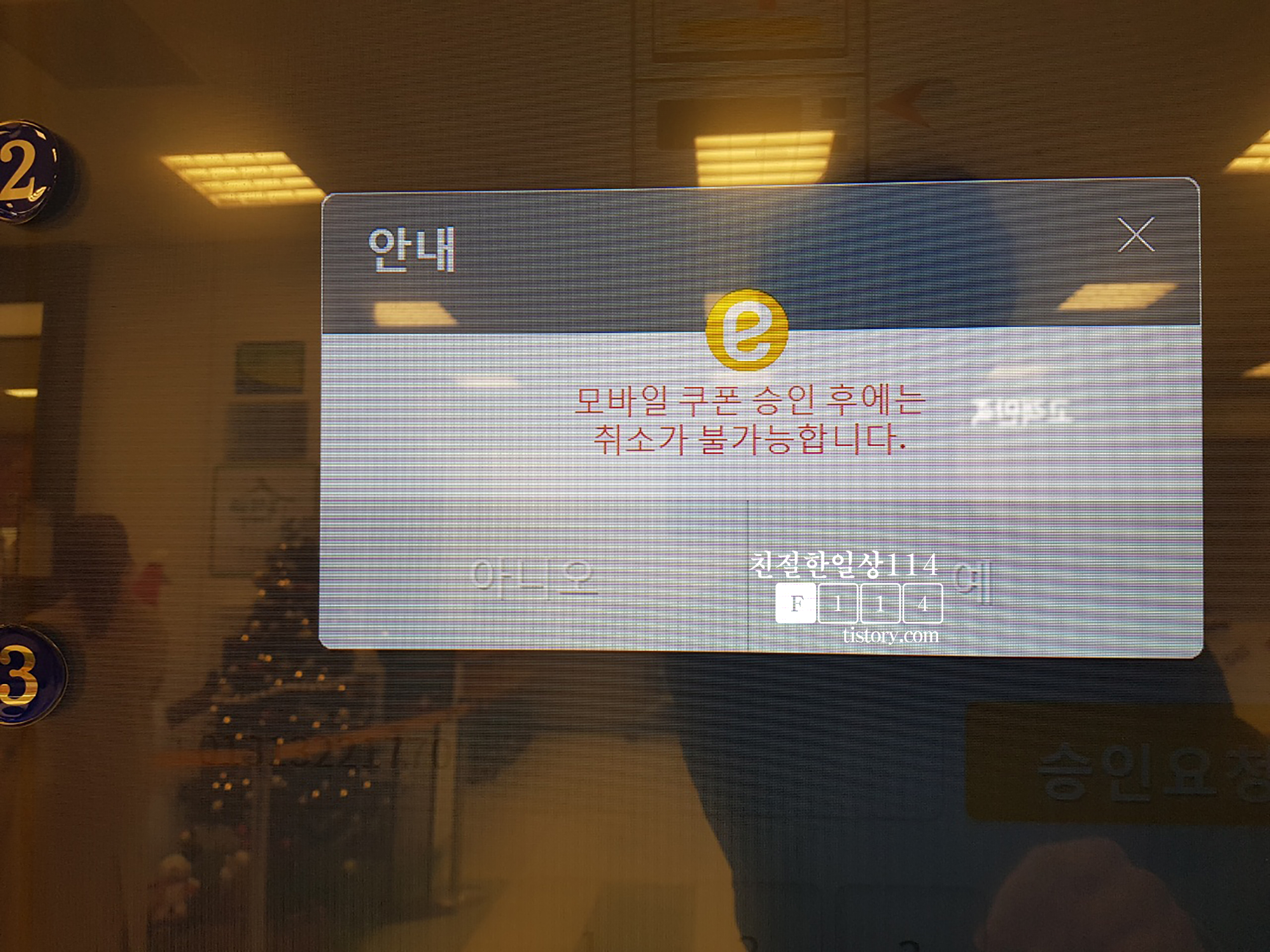 키오스크 오른쪽아래 문자로 수신된 교환권의 바코드를 읽히고 문자에 있는 쿠폰번호를 입력하면 된다.