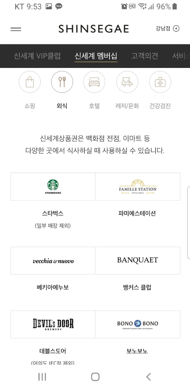 - 외식 사용처로는 스타벅스(일부매장제외) / 파미에스테이션 / 베키아에누보 / 벵커스 클럽 / 데블스도어 / 보노보노 / 빕스(VIPS) / 아웃백 등