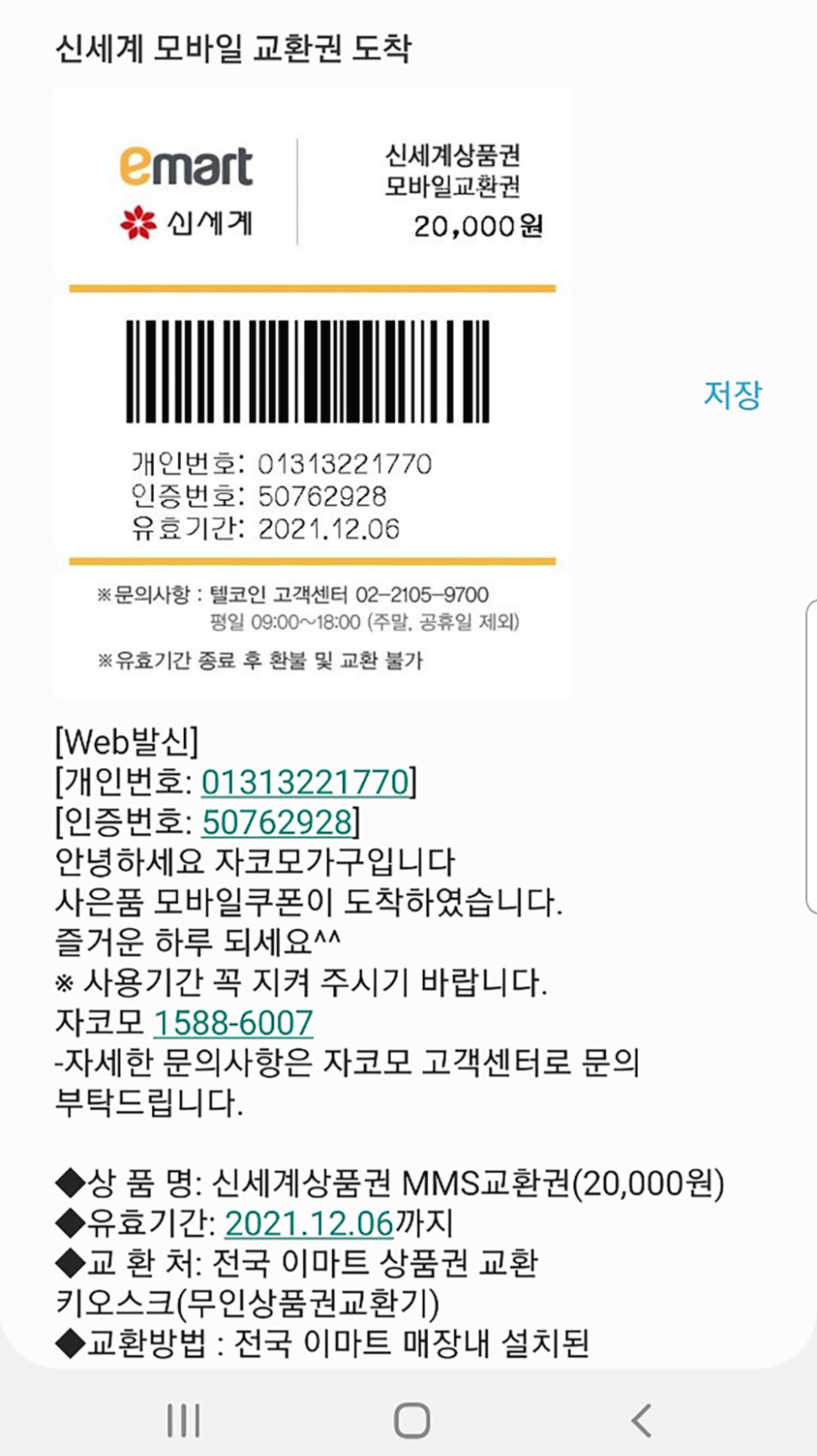 ㅣ신세계 모바일 상품권 MMS 교환권