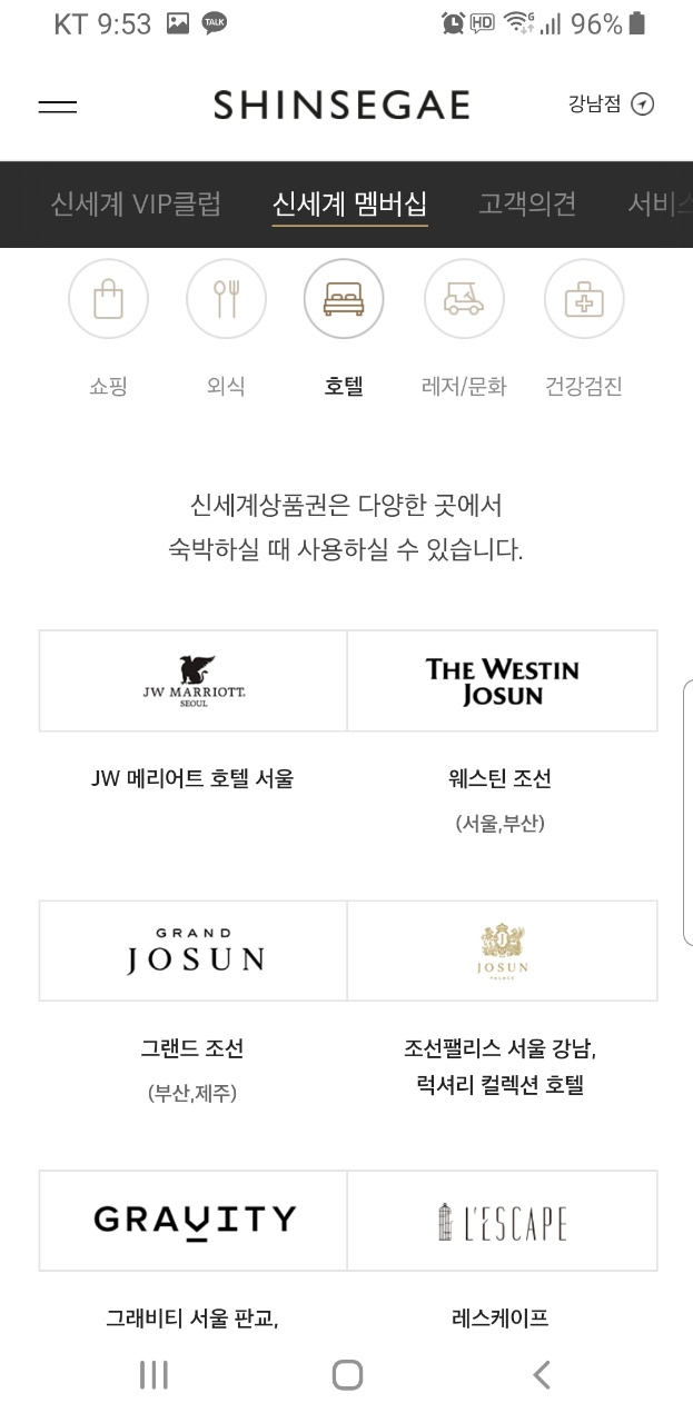 - 숙박/호텔 사용처로는 JW 메리어트 호텔 서울 / 웨스틴조선(서울,부산) / 그랜드 조선(부산,제주) / 조선팰리스 / 레스케이프 / 해운대 센텀 호텔 등